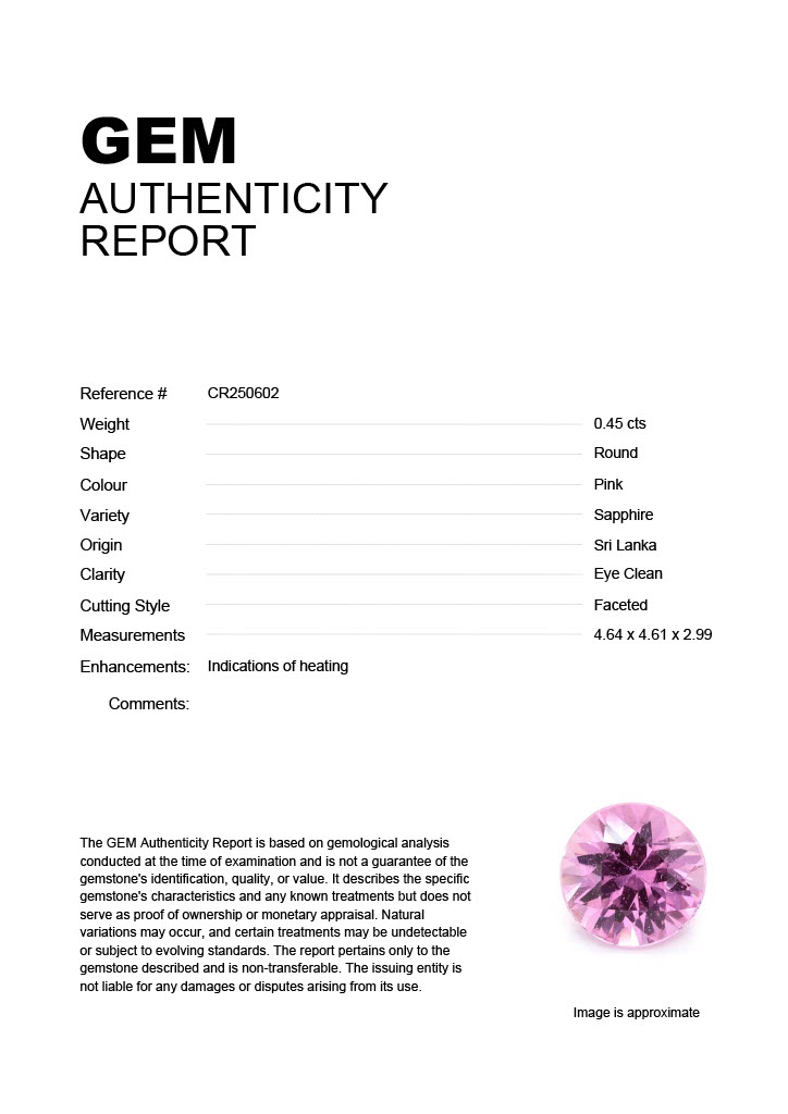 0.45ct Pink Round Sri Lanka SapphireCarat: 0.45 ctType: SapphireCut: RoundColour: PinkOrigin: Sri LankaComment: Heated4.64 x 4.61 x 2.99 mm