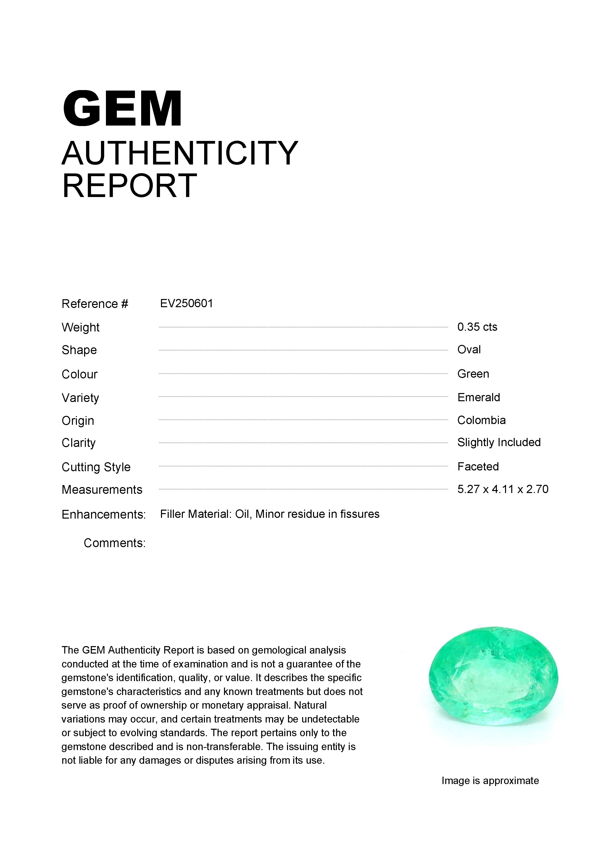 0.35ct Green Oval Colombia EmeraldCarat: 0.35 ctType: EmeraldCut: OvalColour: GreenOrigin: ColombiaComment: Not Heated,