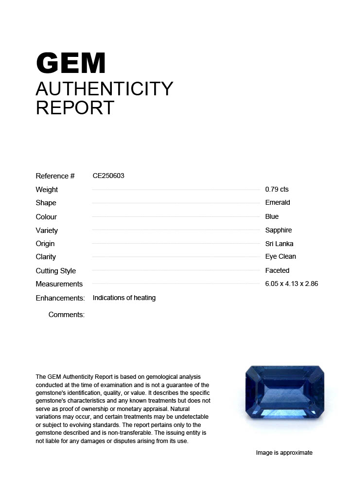 0.79ct Blue Emerald Sri Lanka SapphireCarat: 0.79 ctType: SapphireCut: EmeraldColour: BlueOrigin: Sri LankaComment: Heated6.05 x 4.13 x 2.86 mm