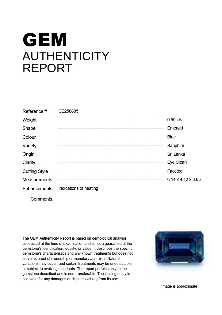 0.90ct Blue Emerald Sri Lanka SapphireCarat: 0.90 ctType: SapphireCut: EmeraldColour: BlueOrigin: Sri LankaComment: Heated6.14 x 4.12 x 3.05 mm