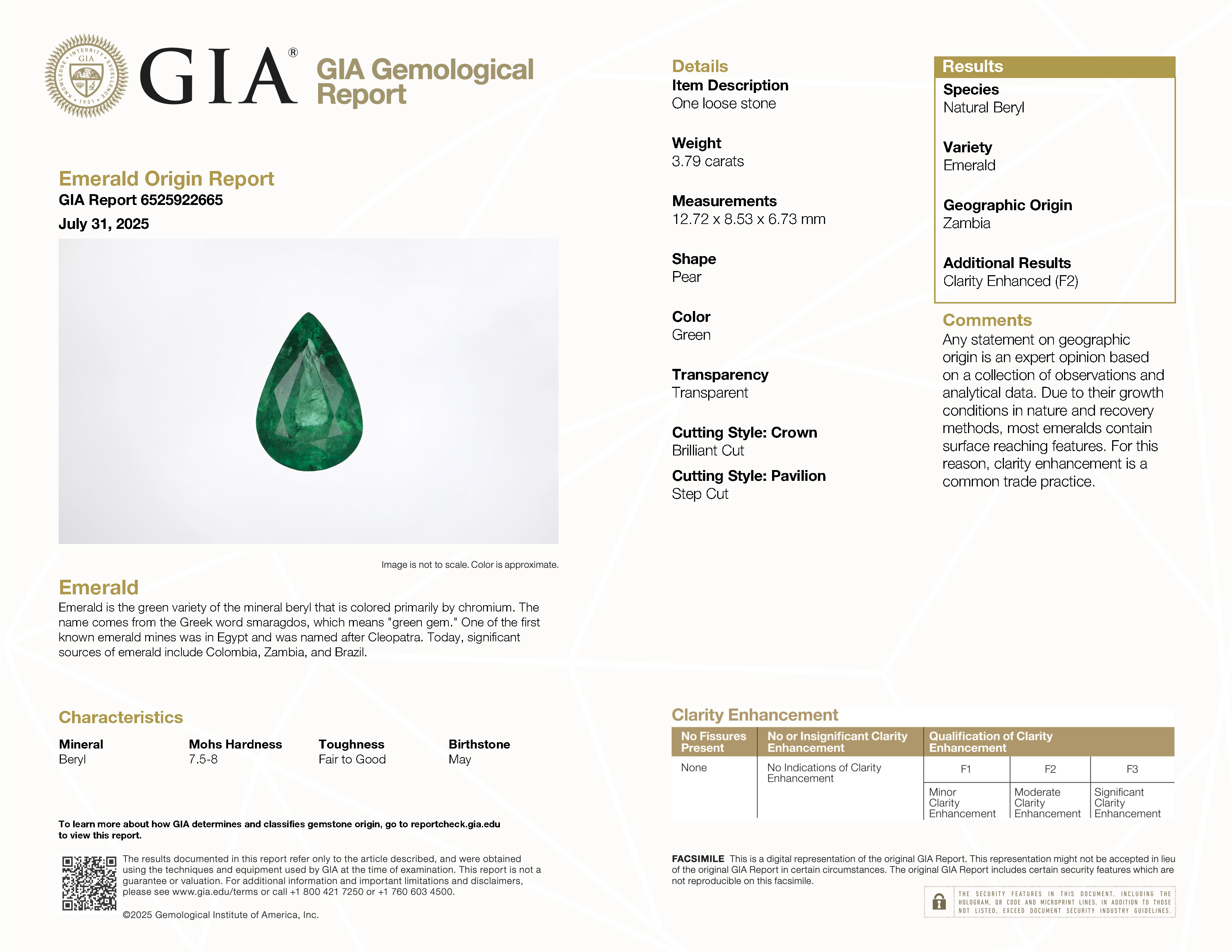 GIA: 6525922665 Stock ID: EP2407243.79ct Green Pear Zambia EmeraldCarat: 3.79 ctType: EmeraldCut: PearColour: GreenOrigin: ZambiaComment: Not Heated,