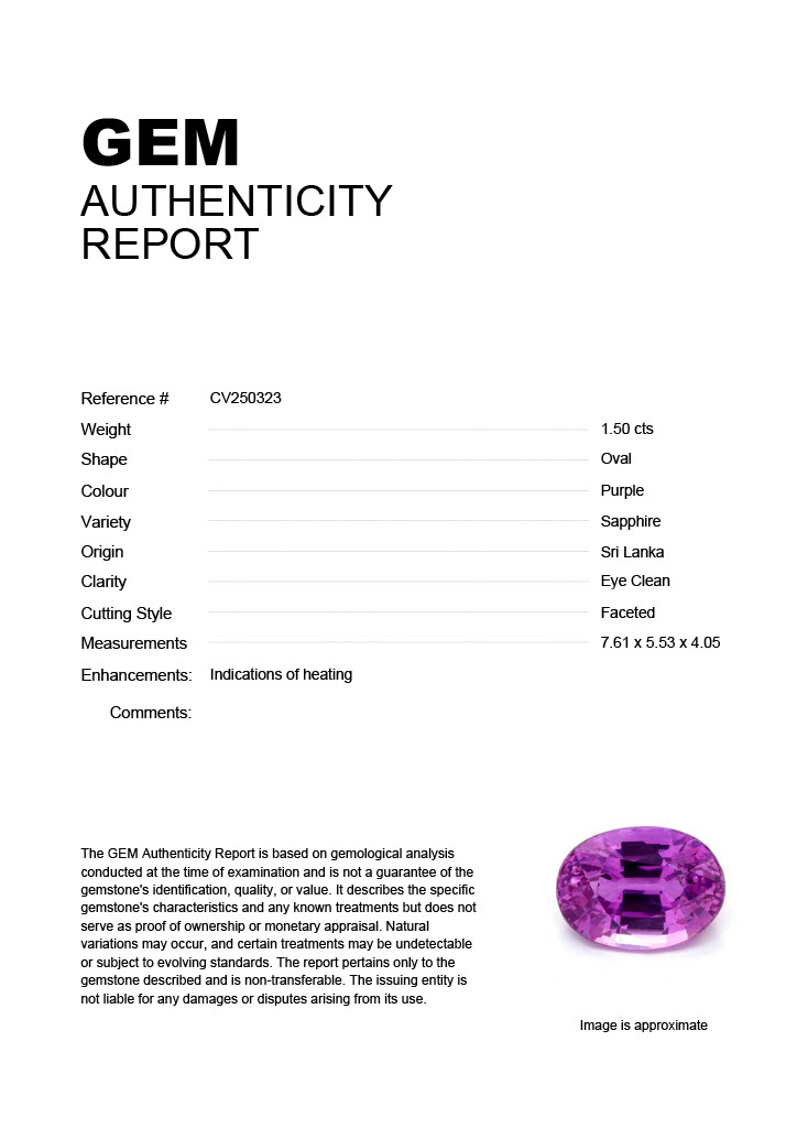 1.50ct Purple Oval Sri Lanka SapphireCarat: 1.50 ctType: SapphireCut: OvalColour: PurpleOrigin: Sri LankaComment: Heated7.61 x 5.53 x 4.05 mm
