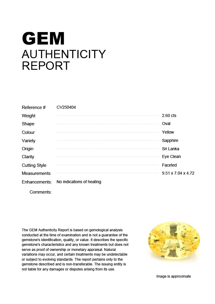 2.60ct Yellow Oval Sri Lanka SapphireCarat: 2.60 ctType: SapphireCut: OvalColour: YellowOrigin: Sri LankaComment: Not Heated9.51 x 7.04 x 4.72 mm