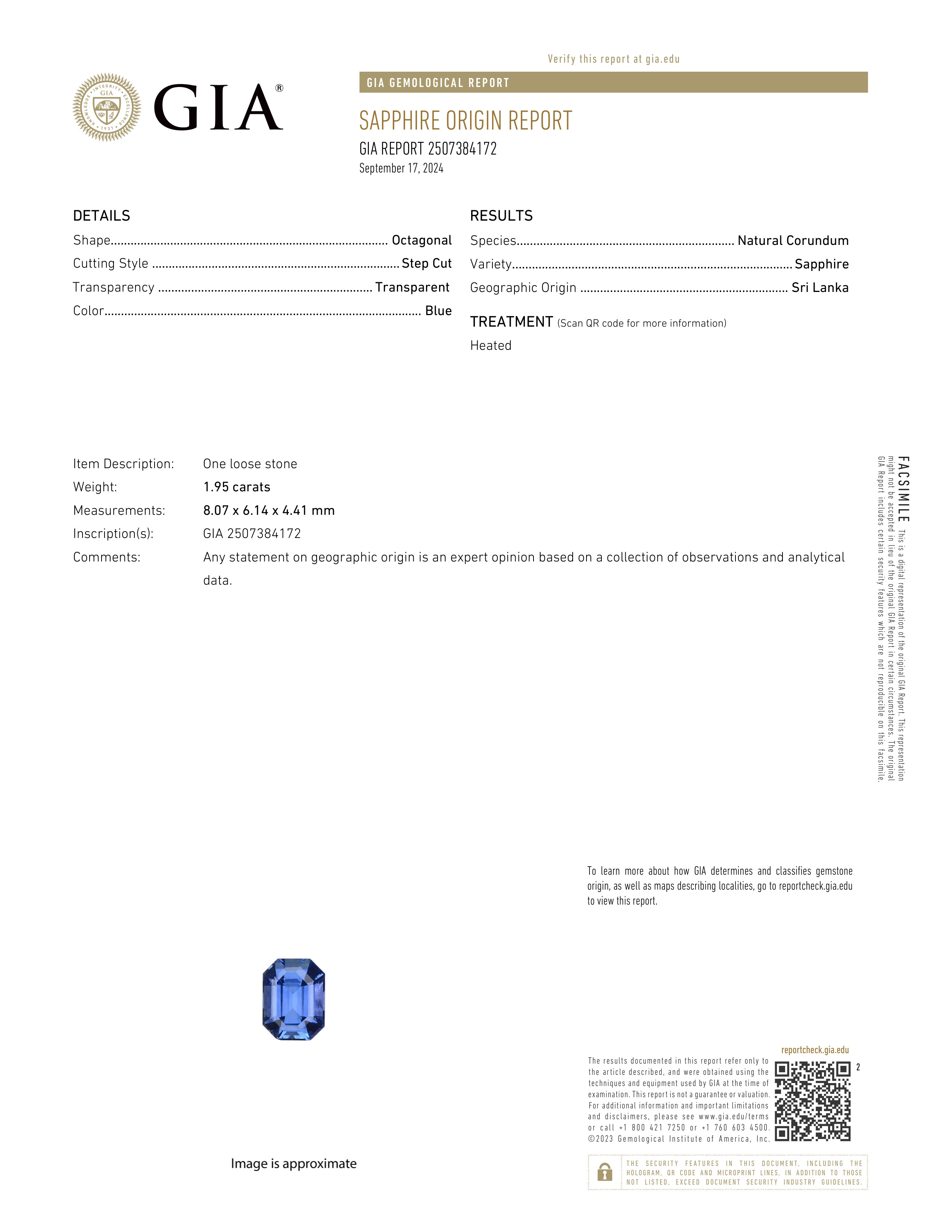 GIA: 2507384172 Stock ID: CE2407031.95ct Blue Emerald Sri Lanka SapphireCarat: 1.95 ctType: SapphireCut: EmeraldColour: BlueOrigin: Sri LankaComment: Heated8.07 x 6.14 x 4.41 mm