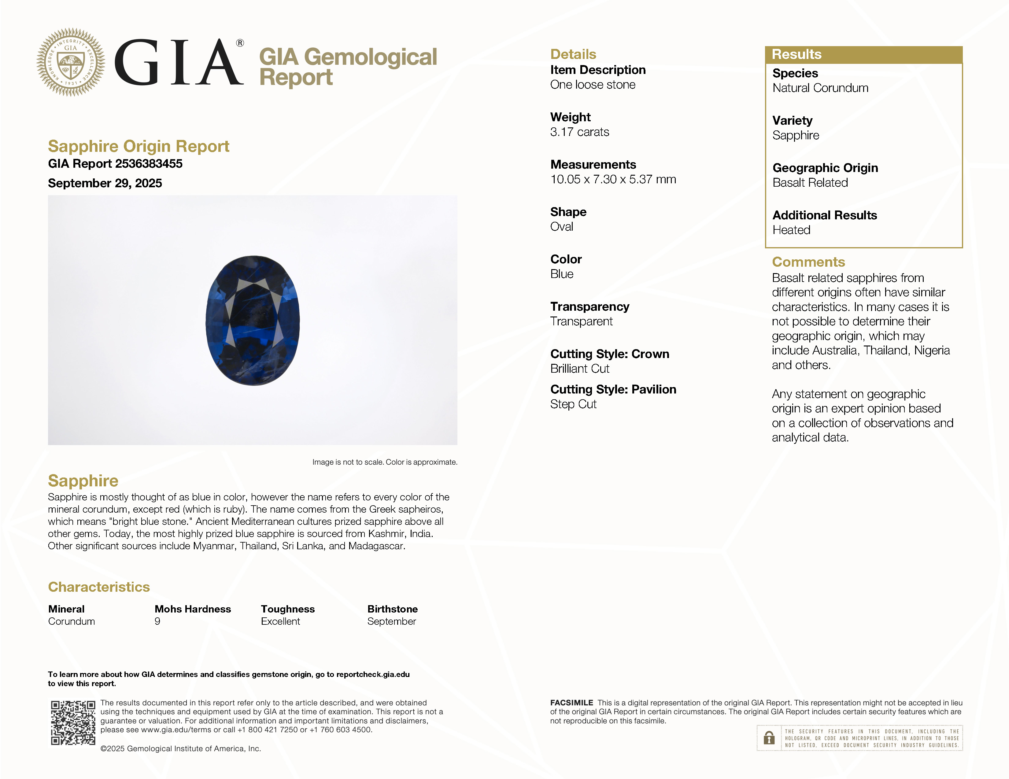 GIA: 2536383455 Stock ID: MSV24110123.17ct Blue Oval Madagascar SapphireCarat: 3.17 ctType: SapphireCut: OvalColour: BlueOrigin: MadagascarComment: Heated10.05 x 7.30 x 5.37 mm