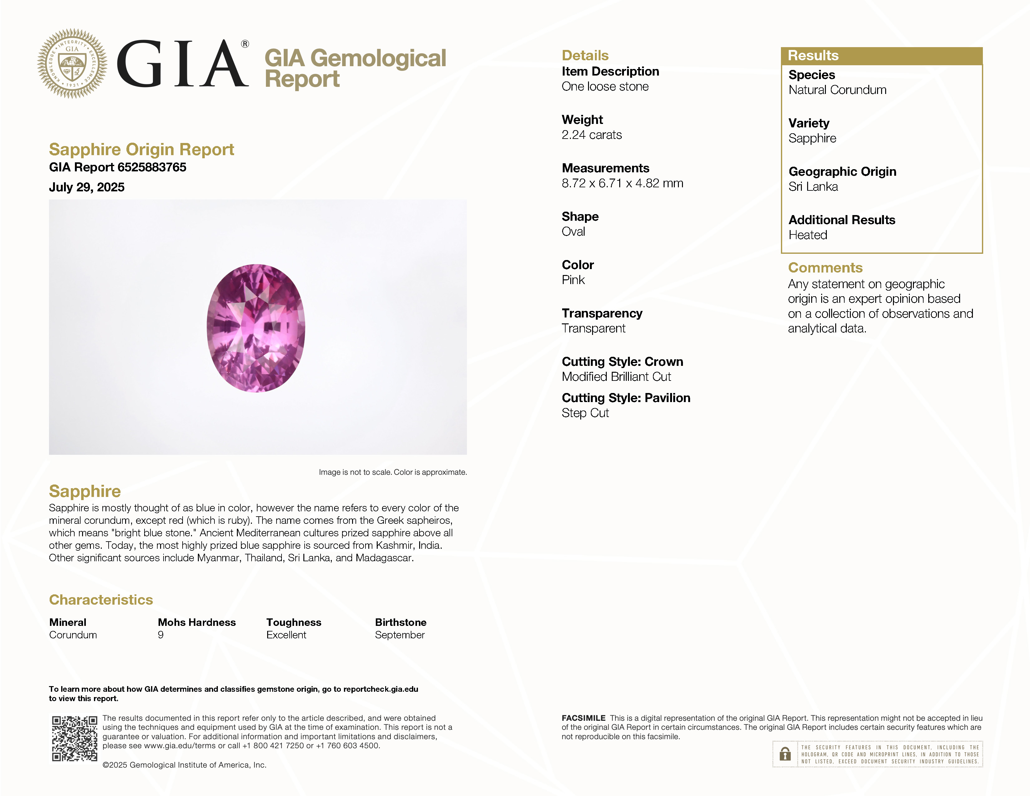 GIA: 6525883765 Stock ID: MSV2411022.24ct Pink Oval Sri Lanka SapphireCarat: 2.24 ctType: SapphireCut: OvalColour: PinkOrigin: Sri LankaComment: Heated8.72 x 6.71 x 4.82 mm