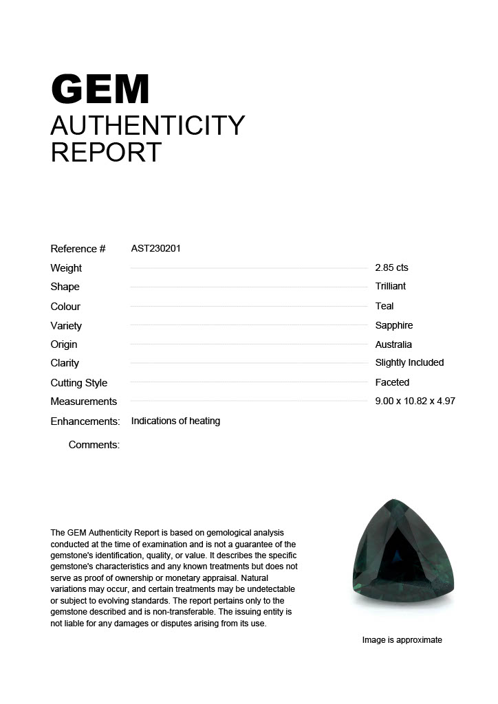 2.85ct Teal Trilliant Australia SapphireCarat: 2.85 ctType: SapphireCut: TrilliantColour: TealOrigin: AustraliaComment: Heated9.00 x 10.82 x 4.97 mm
