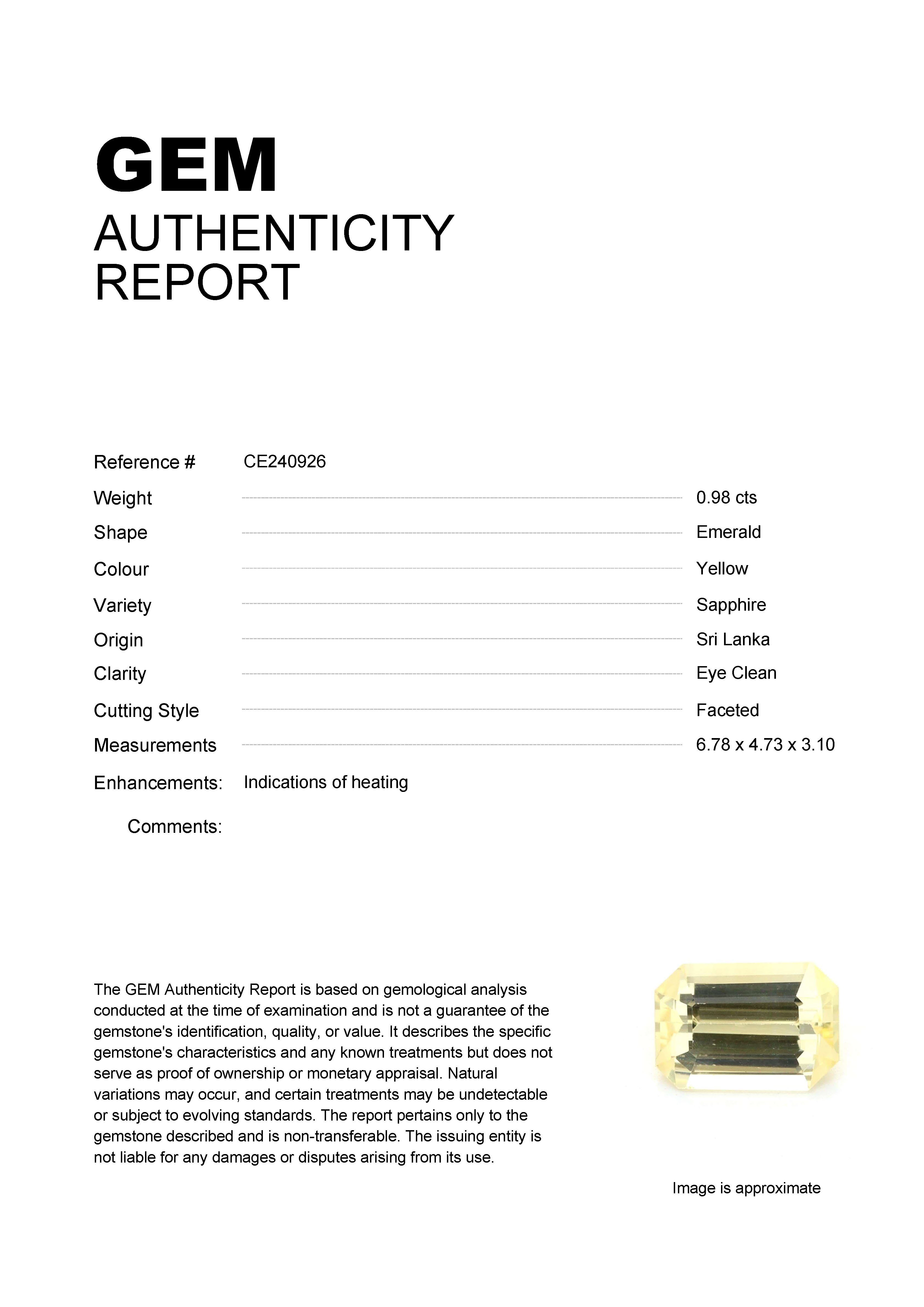0.98ct Yellow Emerald Sri Lanka SapphireCarat: 0.98 ctType: SapphireCut: EmeraldColour: YellowOrigin: Sri LankaComment: Heated6.78 x 4.73 x 3.10 mm
