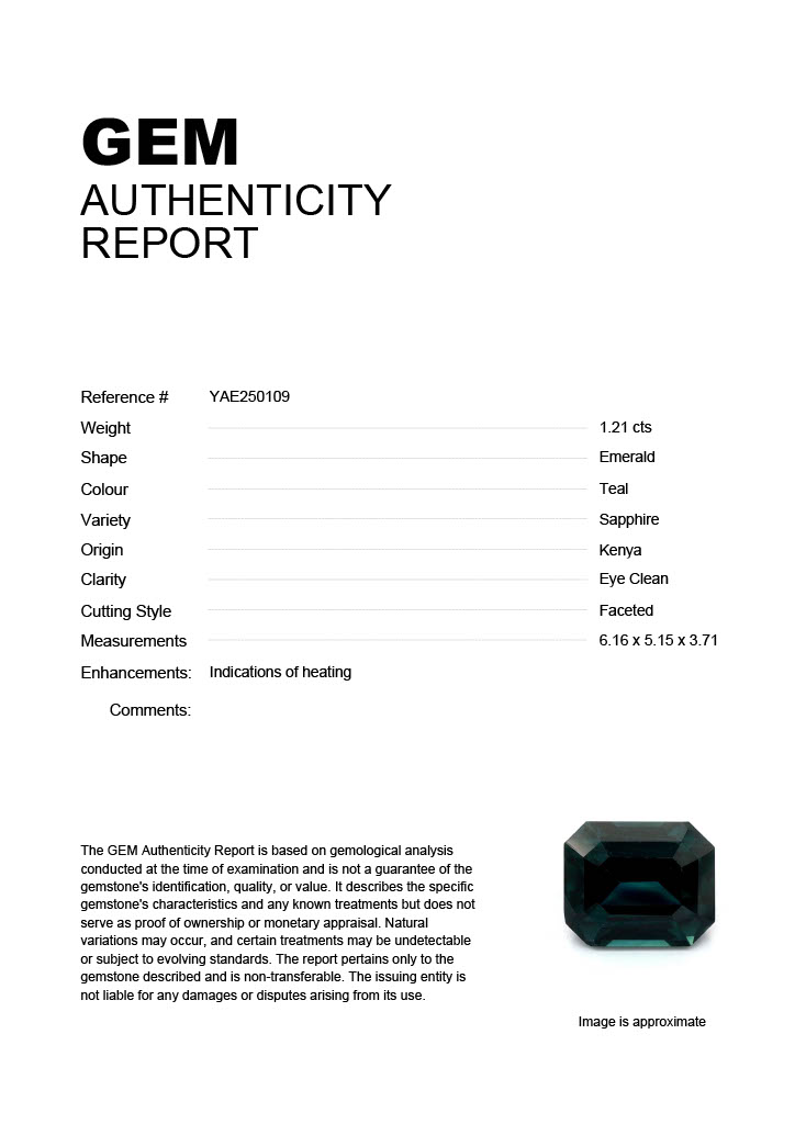 1.21ct Teal Emerald Kenya SapphireCarat: 1.21 ctType: SapphireCut: EmeraldColour: TealOrigin: KenyaComment: Heated6.16 x 5.15 x 3.71 mm