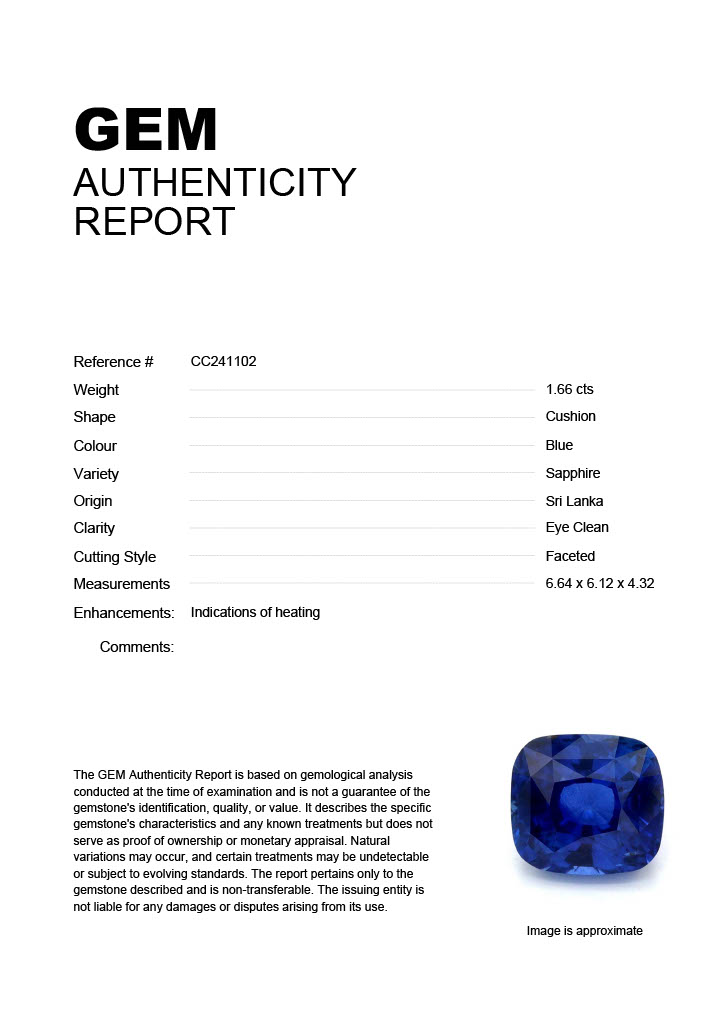 1.66ct Blue Cushion Sri Lanka SapphireCarat: 1.66 ctType: SapphireCut: CushionColour: BlueOrigin: Sri LankaComment: Heated6.64 x 6.12 x 4.32 mm