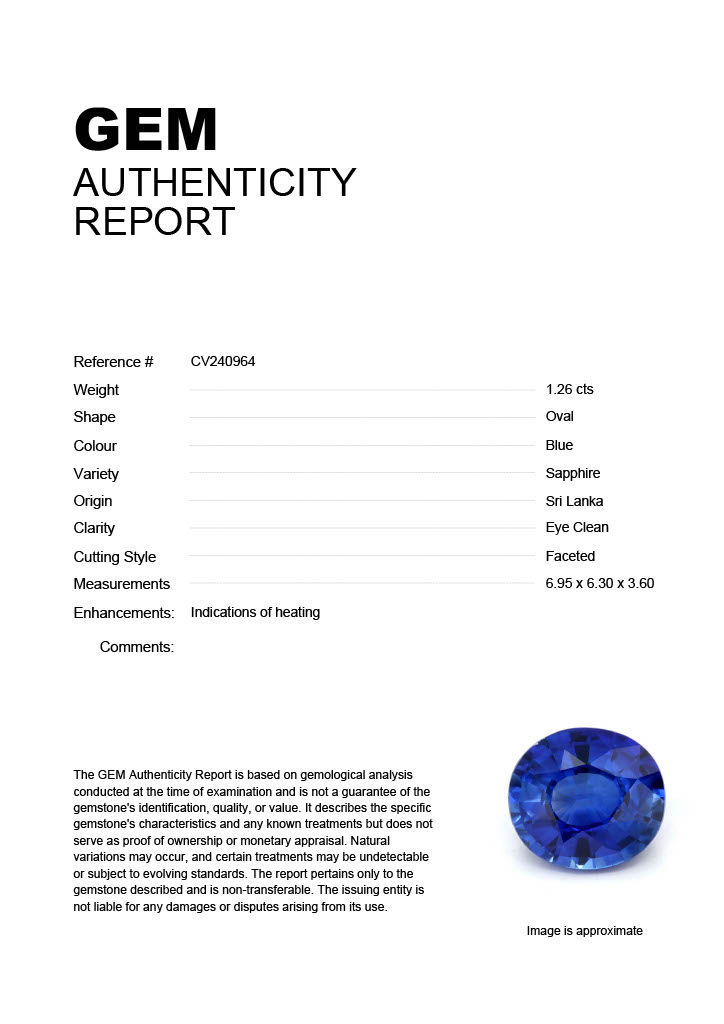 1.26ct Blue Oval Sri Lanka SapphireCarat: 1.26 ctType: SapphireCut: OvalColour: BlueOrigin: Sri LankaComment: Heated6.95 x 6.30 x 3.60 mm