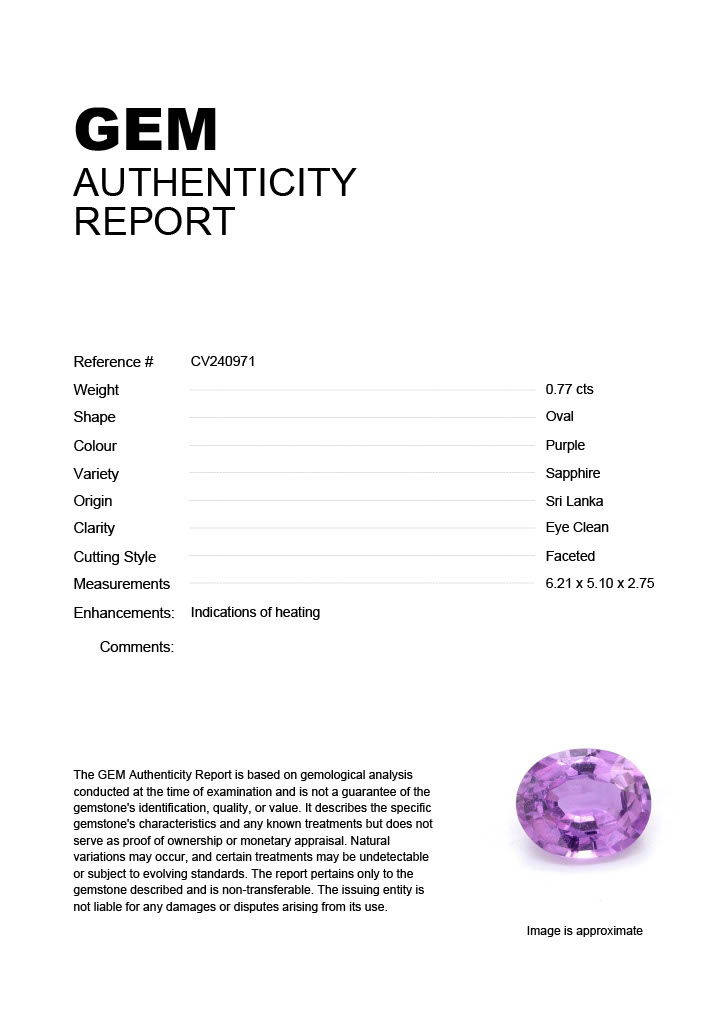 0.77ct Purple Oval Sri Lanka SapphireCarat: 0.77 ctType: SapphireCut: OvalColour: PurpleOrigin: Sri LankaComment: Heated6.21 x 5.10 x 2.75 mm