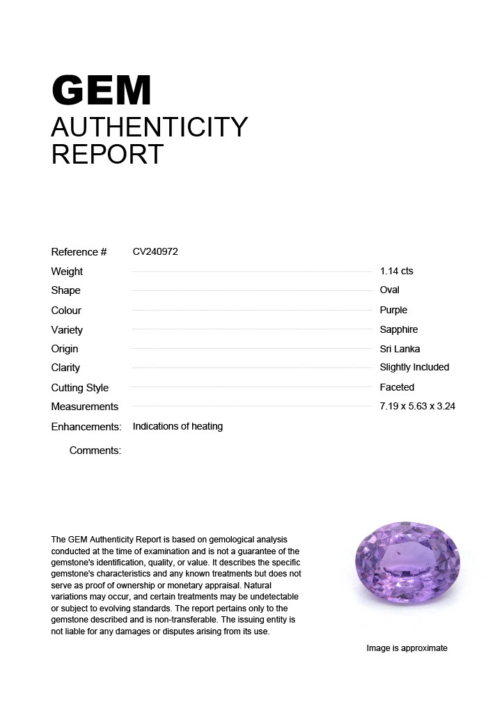 1.14ct Purple Oval Sri Lanka SapphireCarat: 1.14 ctType: SapphireCut: OvalColour: PurpleOrigin: Sri LankaComment: Heated7.19 x 5.63 x 3.24 mm