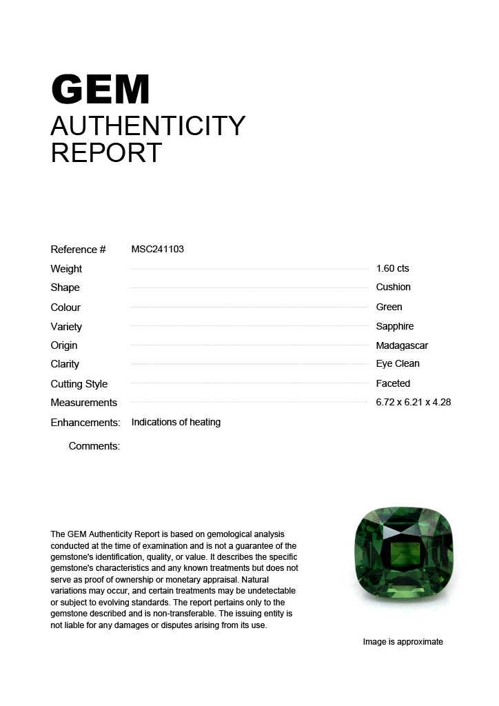 1.60ct Green Cushion Madagascar SapphireCarat: 1.60 ctType: SapphireCut: CushionColour: GreenOrigin: MadagascarComment: Heated6.72 x 6.21 x 4.28 mm