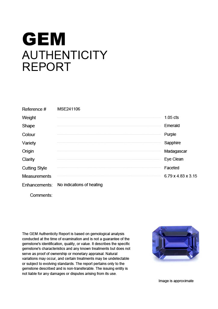 1.05ct Purple Emerald Madagascar SapphireCarat: 1.05 ctType: SapphireCut: EmeraldColour: PurpleOrigin: MadagascarComment: Not Heated6.79 x 4.83 x 3.15 mm