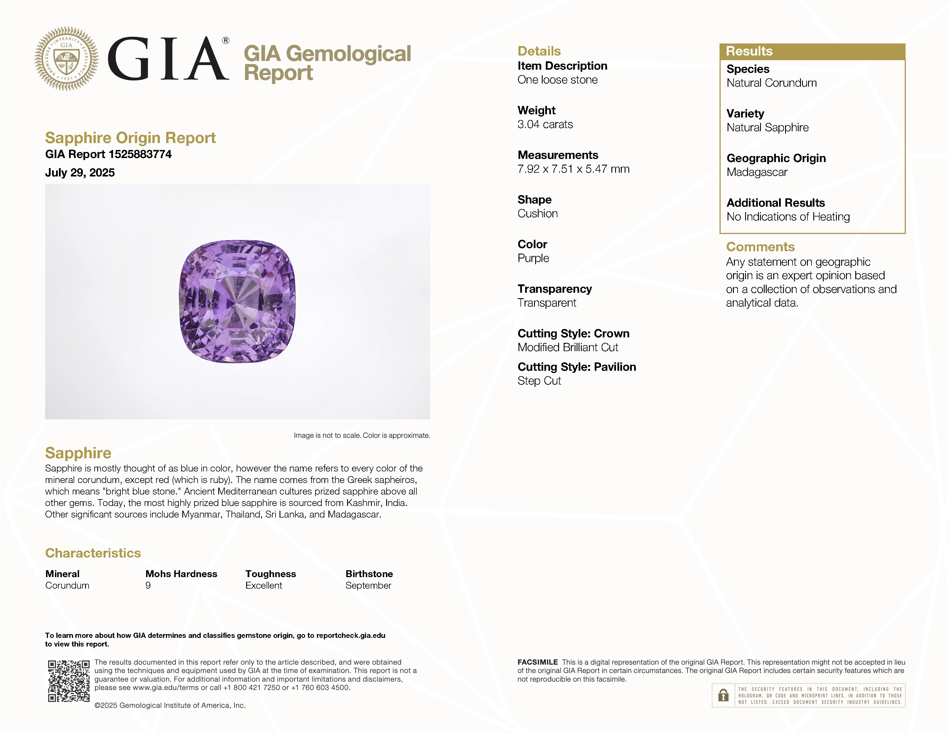 GIA: 1525883774 Stock ID: MSC2409063.04ct Purple Cushion Madagascar SapphireCarat: 3.04 ctType: SapphireCut: CushionColour: PurpleOrigin: MadagascarComment: Not Heated7.92 x 7.51 x 5.47 mm