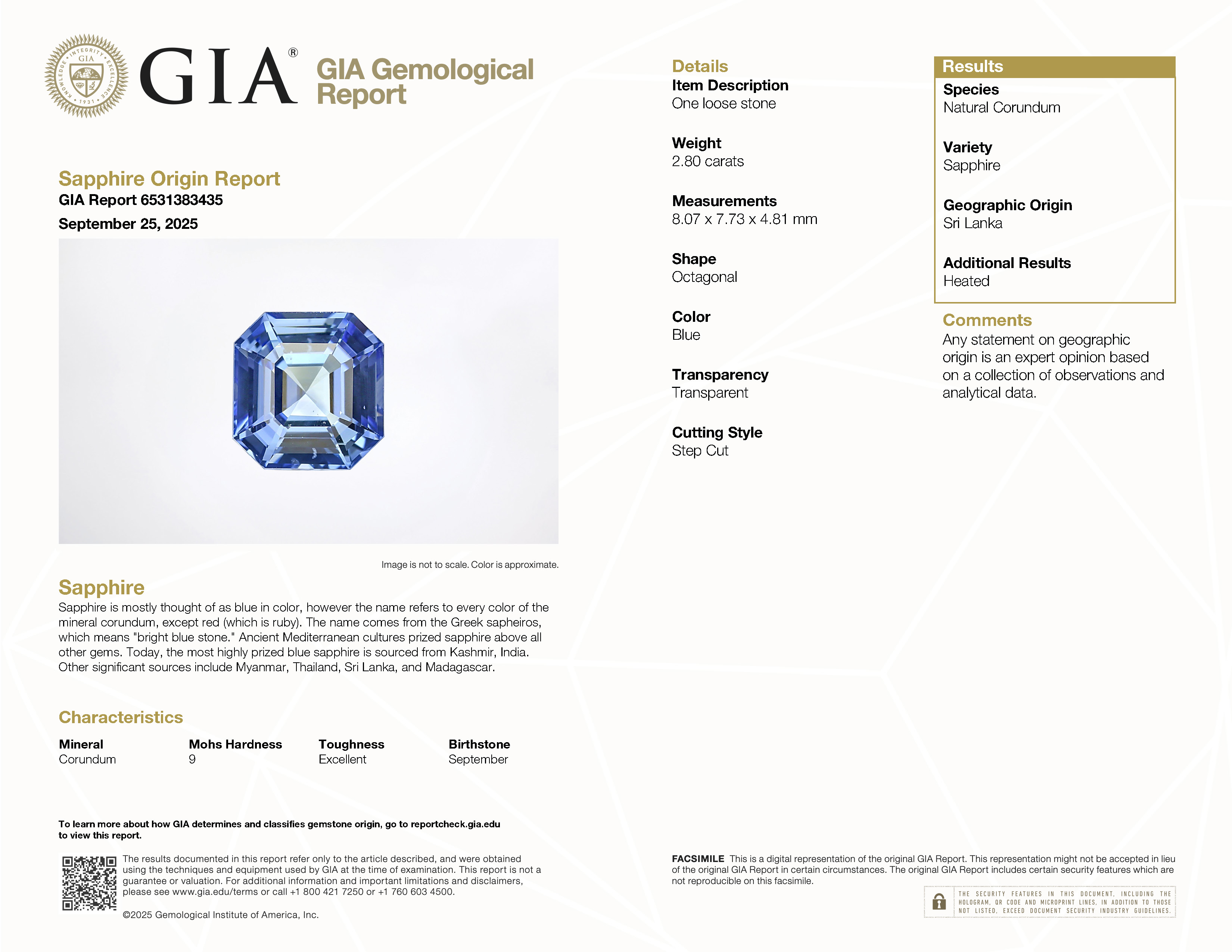 GIA: 6531383435 Stock ID: CE2409162.80ct Blue Emerald Sri Lanka SapphireCarat: 2.80 ctType: SapphireCut: EmeraldColour: BlueOrigin: Sri LankaComment: Heated8.07 x 7.73 x 4.81 mm