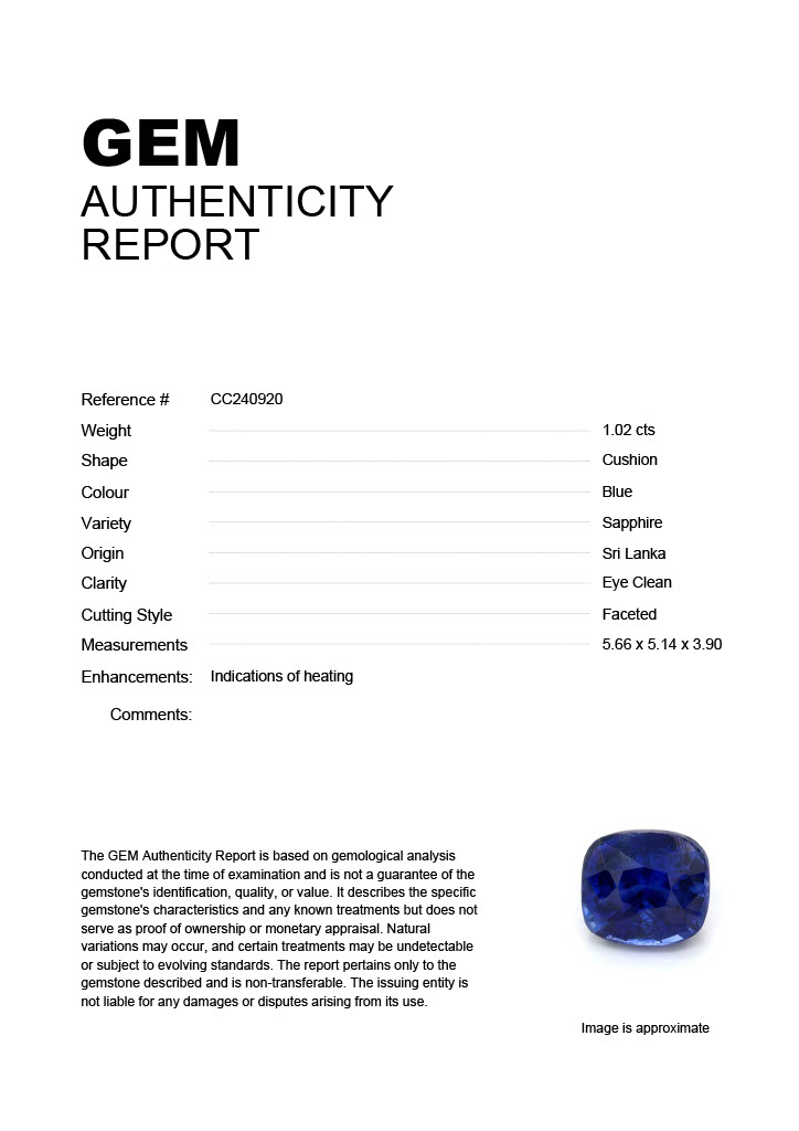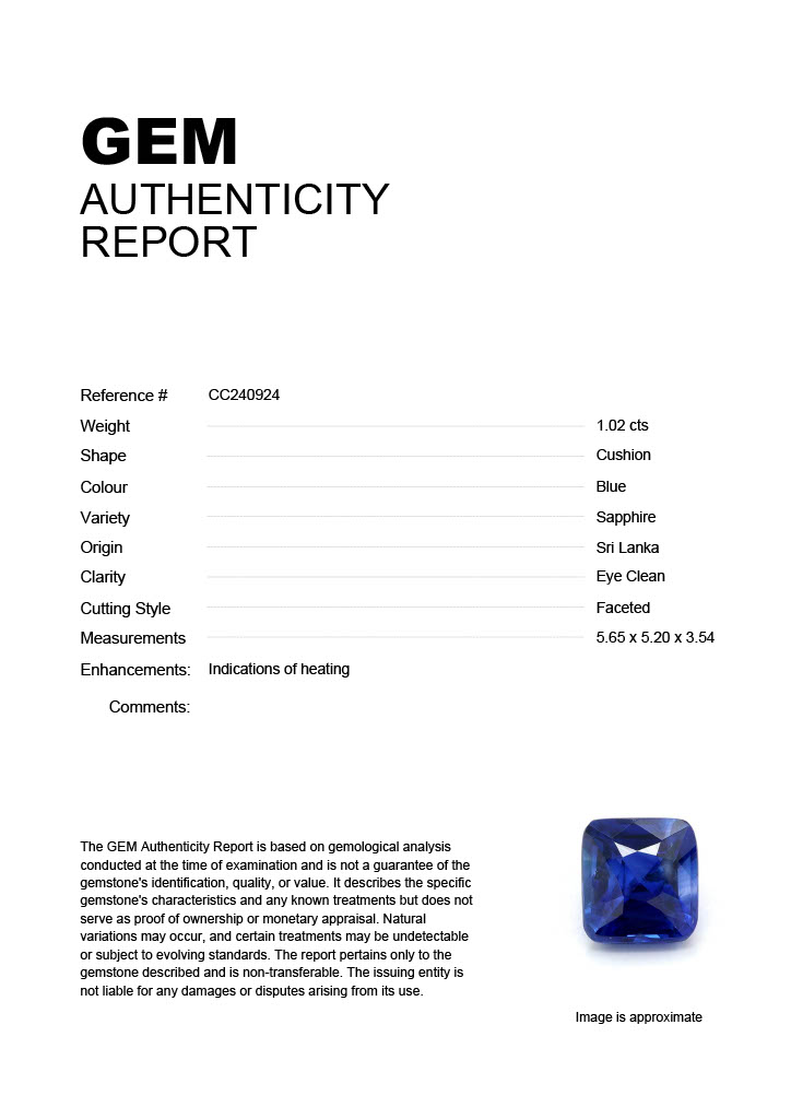 1.02ct Blue Cushion Sri Lanka SapphireCarat: 1.02 ctType: SapphireCut: CushionColour: BlueOrigin: Sri LankaComment: Heated5.65 x 5.20 x 3.54 mm