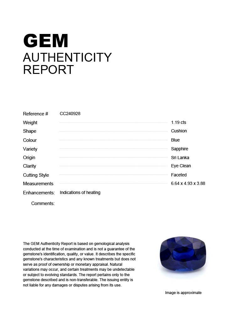 1.19ct Blue Cushion Sri Lanka SapphireCarat: 1.19 ctType: SapphireCut: CushionColour: BlueOrigin: Sri LankaComment: Heated6.64 x 4.93 x 3.88 mm