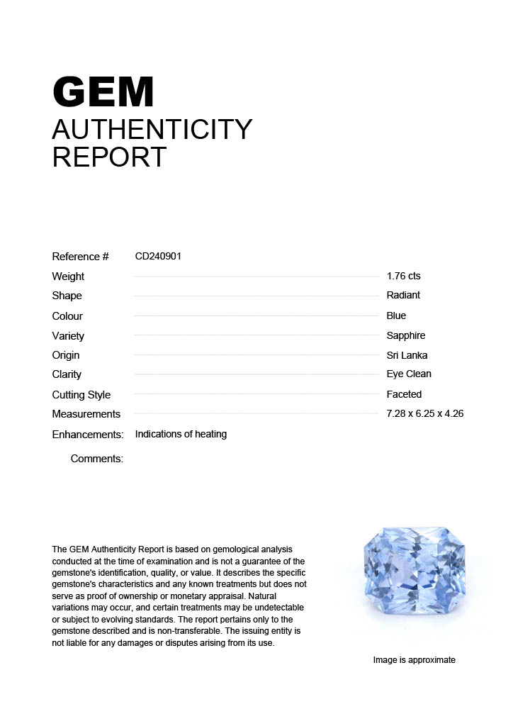 1.76ct Blue Radiant Sri Lanka SapphireCarat: 1.76 ctType: SapphireCut: RadiantColour: BlueOrigin: Sri LankaComment: Heated7.28 x 6.25 x 4.26 mm