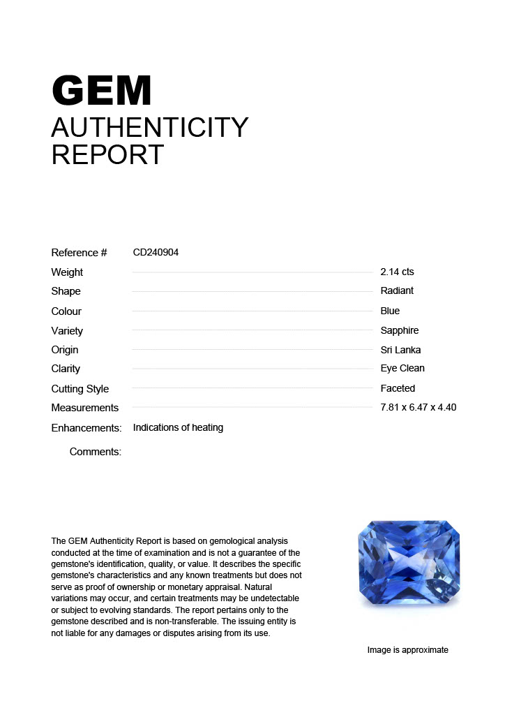 2.14ct Blue Radiant Sri Lanka SapphireCarat: 2.14 ctType: SapphireCut: RadiantColour: BlueOrigin: Sri LankaComment: Heated7.81 x 6.47 x 4.40 mm