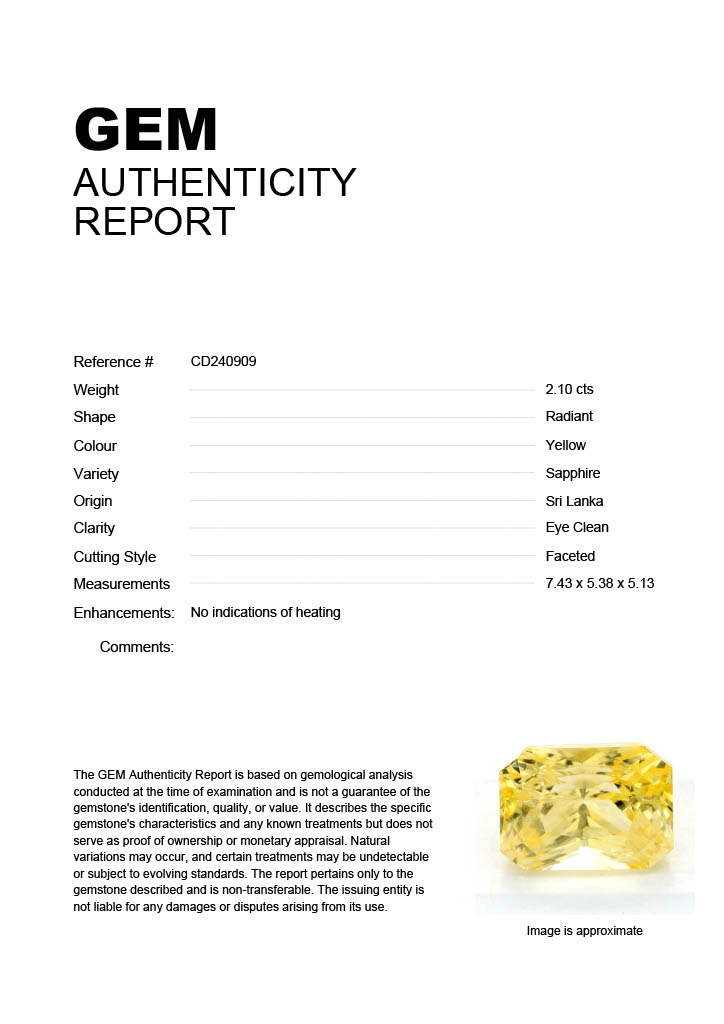 2.10ct Yellow Radiant Sri Lanka SapphireCarat: 2.10 ctType: SapphireCut: RadiantColour: YellowOrigin: Sri LankaComment: Not Heated7.43 x 5.38 x 5.13 mm