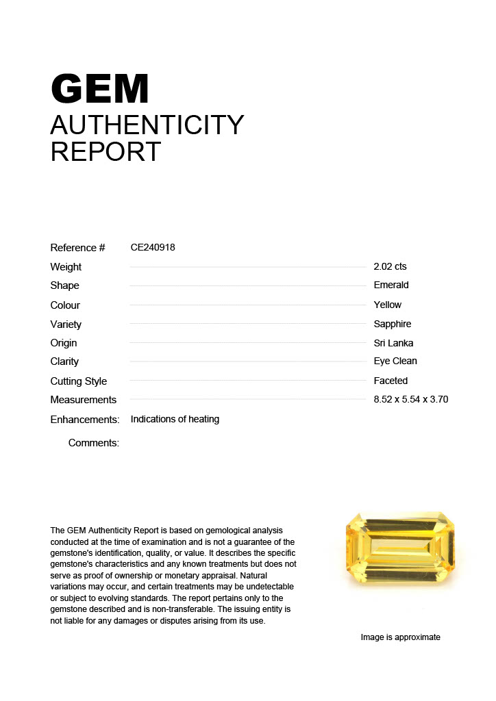 2.02ct Yellow Emerald Sri Lanka SapphireCarat: 2.02 ctType: SapphireCut: EmeraldColour: YellowOrigin: Sri LankaComment: Heated8.52 x 5.54 x 3.70 mm