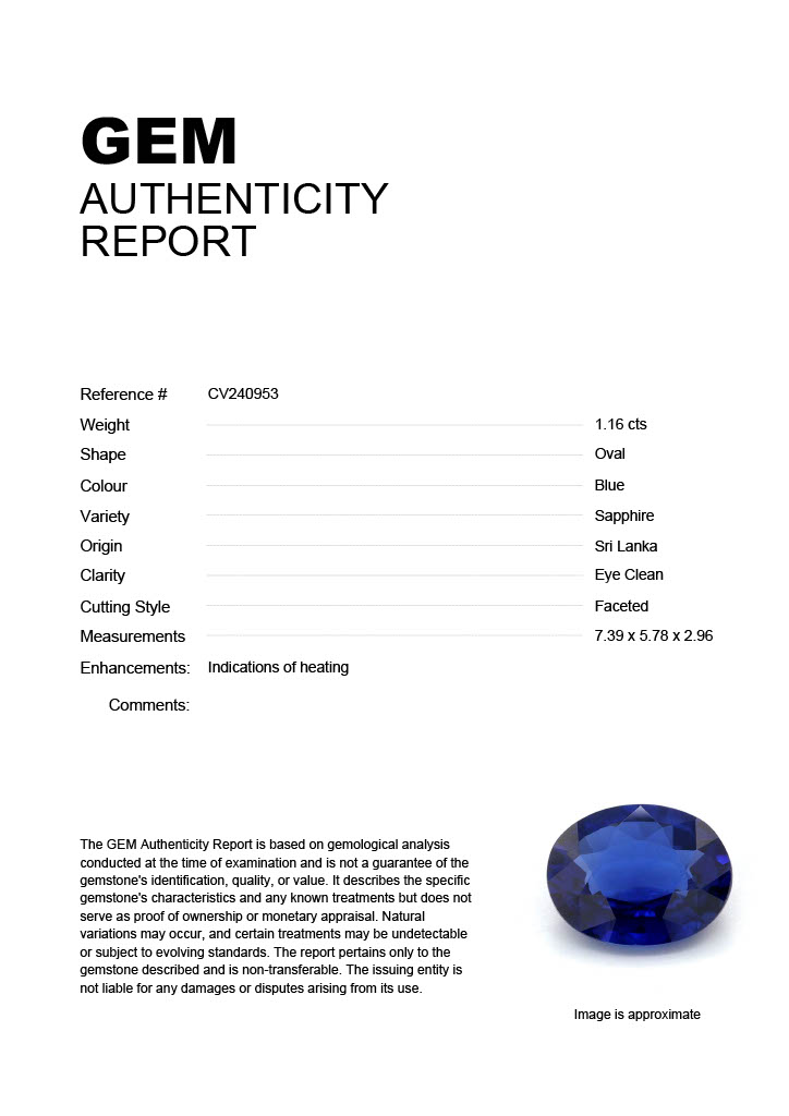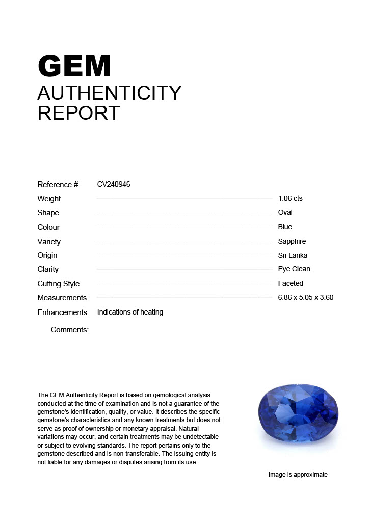 1.06ct Blue Oval Sri Lanka SapphireCarat: 1.06 ctType: SapphireCut: OvalColour: BlueOrigin: Sri LankaComment: Heated6.86 x 5.05 x 3.60 mm