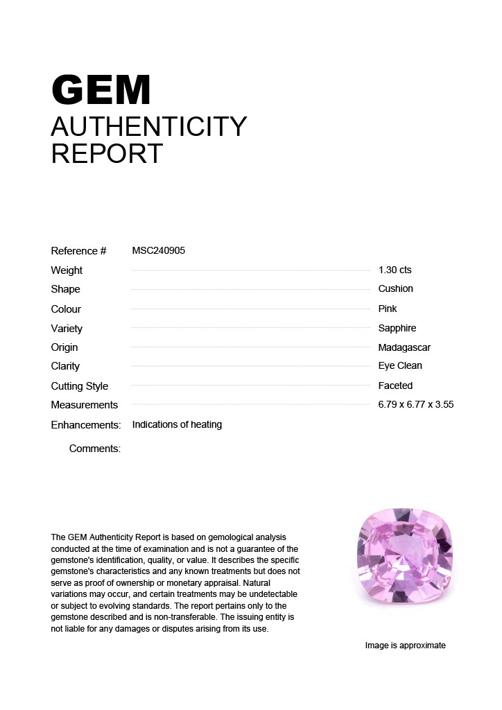 1.30ct Pink Cushion Madagascar SapphireCarat: 1.30 ctType: SapphireCut: CushionColour: PinkOrigin: MadagascarComment: Heated6.79 x 6.77 x 3.55 mm