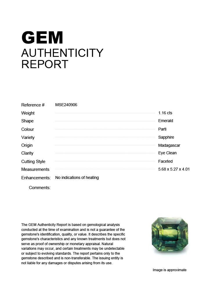 1.16ct Parti Emerald Madagascar SapphireCarat: 1.16 ctType: SapphireCut: EmeraldColour: PartiOrigin: MadagascarComment: Not Heated5.68 x 5.27 x 4.01 mm