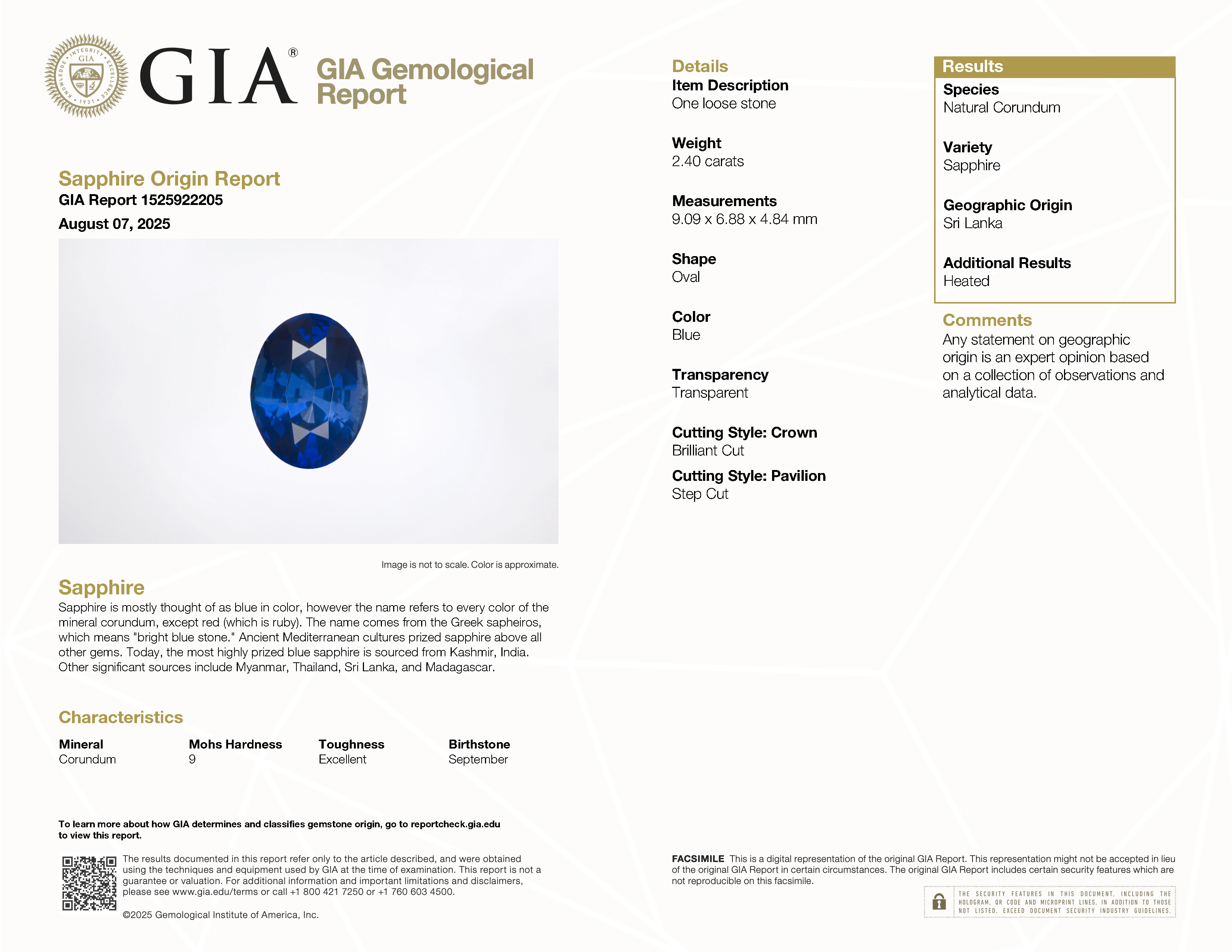 GIA: 1525922205 Stock ID: CV2407032.40ct Blue Oval Sri Lanka SapphireCarat: 2.40 ctType: SapphireCut: OvalColour: BlueOrigin: Sri LankaComment: Heated9.09 x 6.88 x 4.84 mm