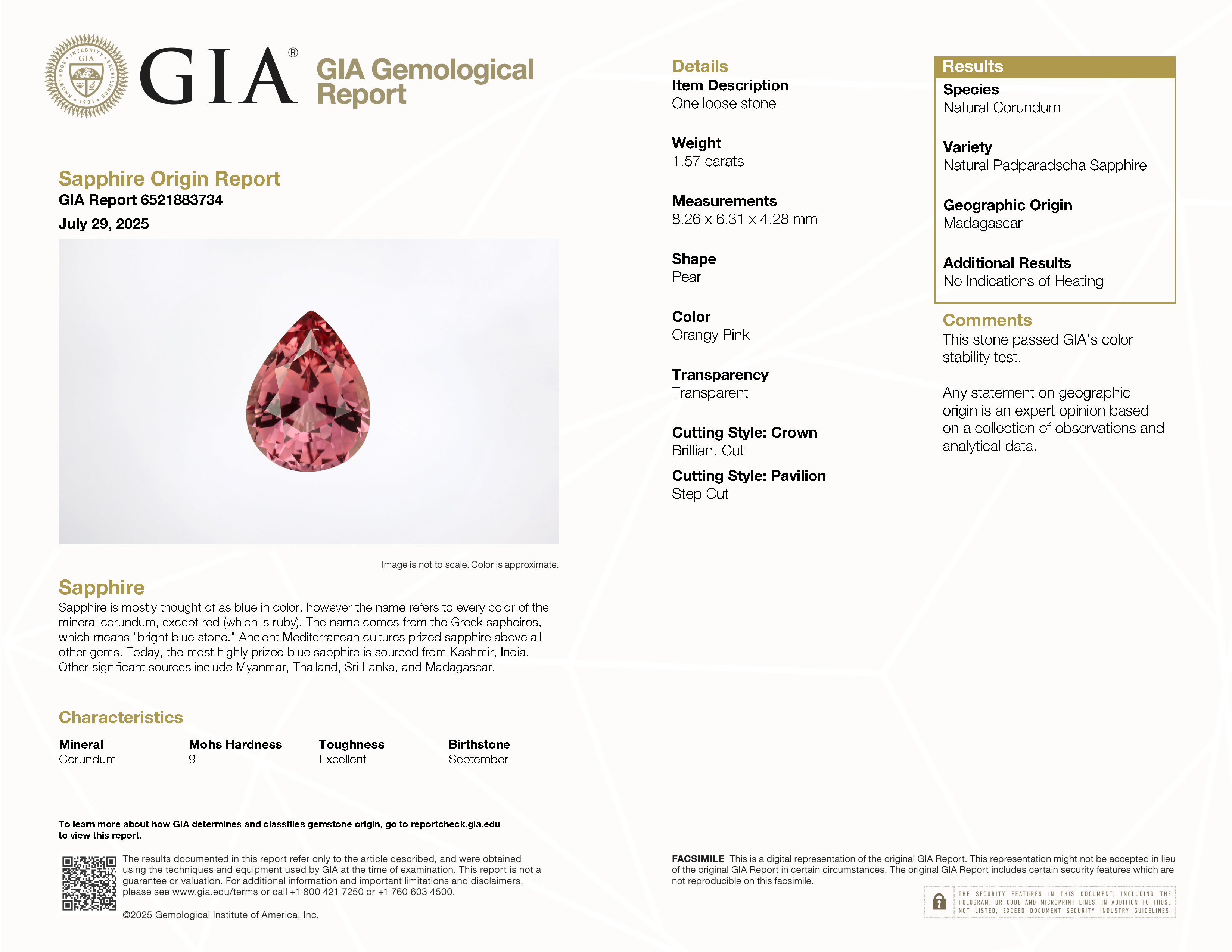 GIA: 6521883734 Stock ID: MSP2406021.57ct Padparadscha Pear Madagascar SapphireCarat: 1.57 ctType: SapphireCut: PearColour: PadparadschaOrigin: MadagascarComment: Not Heated8.26 x 6.31 x 4.28 mm