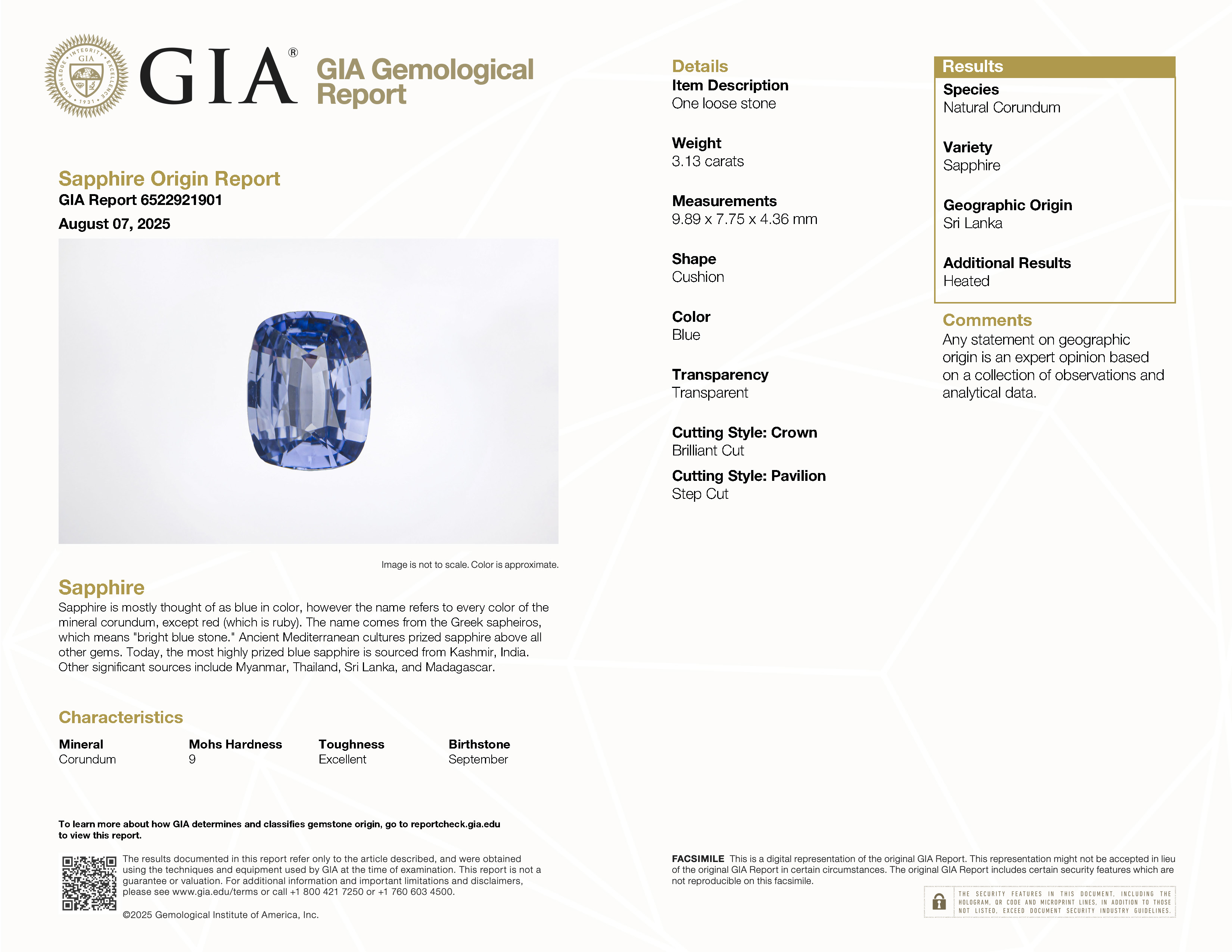 GIA: 6522921901 Stock ID: CC2407023.13ct Blue Cushion Sri Lanka SapphireCarat: 3.13 ctType: SapphireCut: CushionColour: BlueOrigin: Sri LankaComment: Heated9.89 x 7.75 x 4.65 mm
