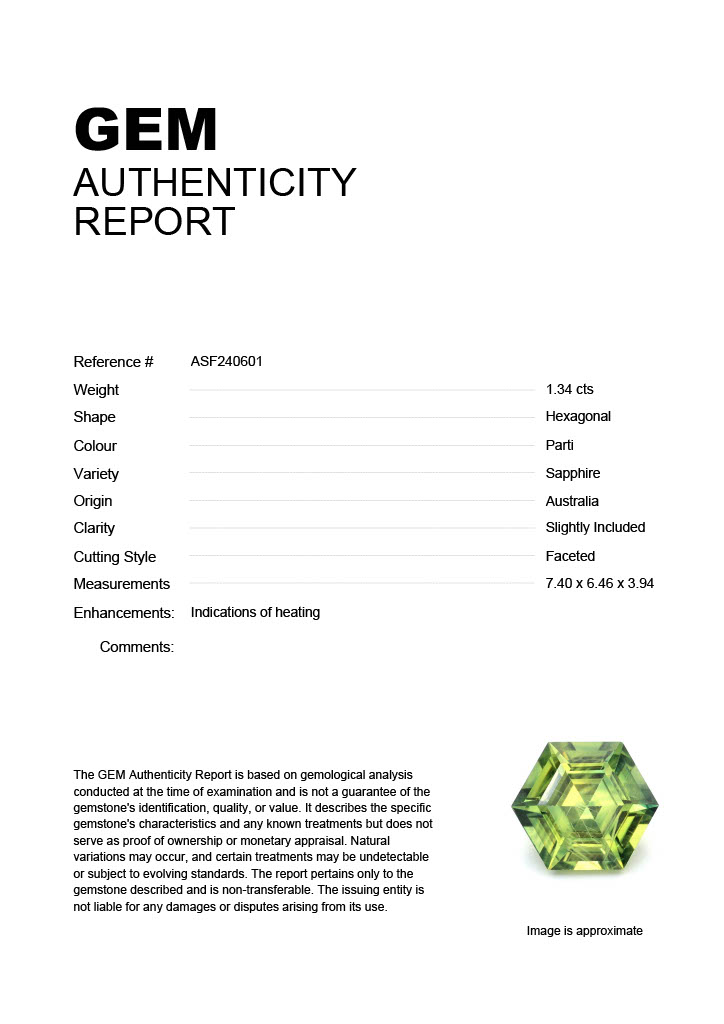 1.34ct Parti Hexagonal Australia SapphireCarat: 1.34 ctType: SapphireCut: HexagonalColour: PartiOrigin: AustraliaComment: Heated7.40 x 6.46 x 3.94 mm