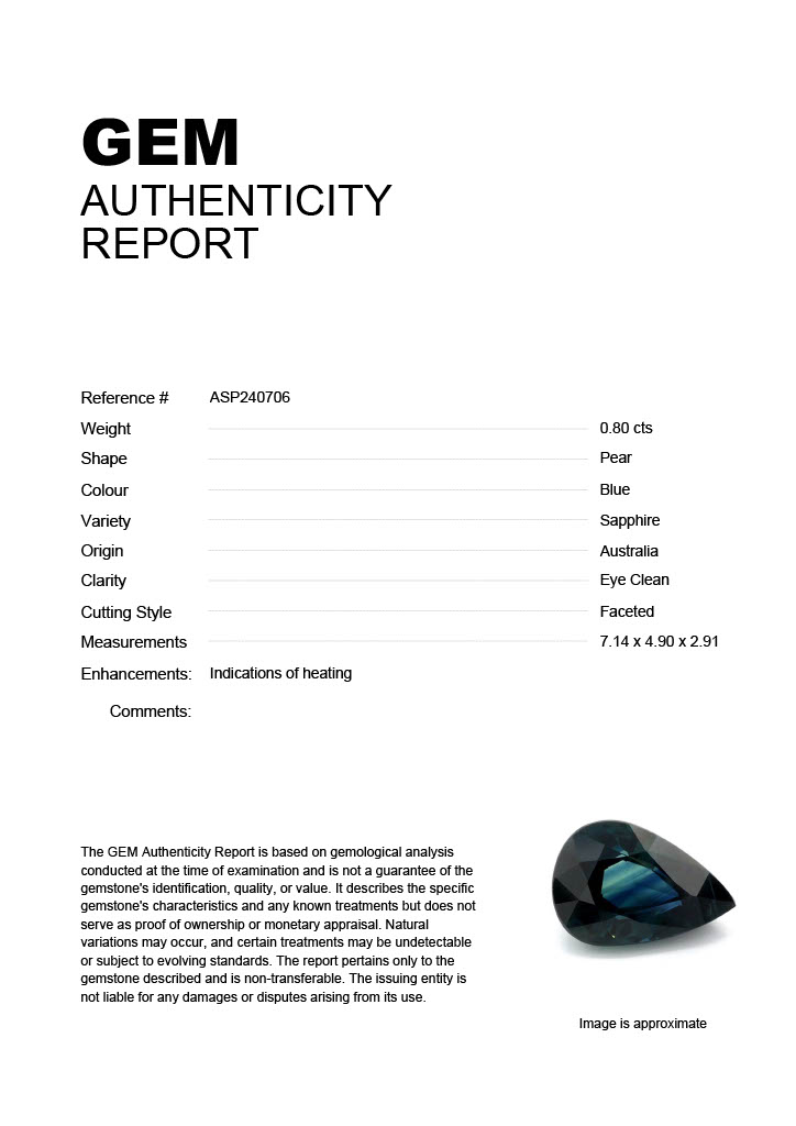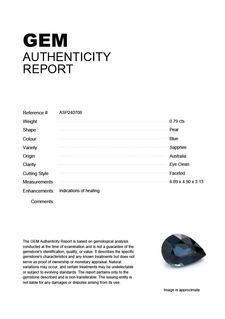 0.80ct Blue Pear Australia SapphireCarat: 0.80 ctType: SapphireCut: PearColour: BlueOrigin: AustraliaComment: Heated7.14 x 4.90 x 2.91 mm