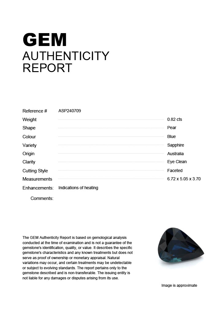 0.82ct Blue Pear Australia SapphireCarat: 0.82 ctType: SapphireCut: PearColour: BlueOrigin: AustraliaComment: Heated6.72 x 5.05 x 3.70 mm
