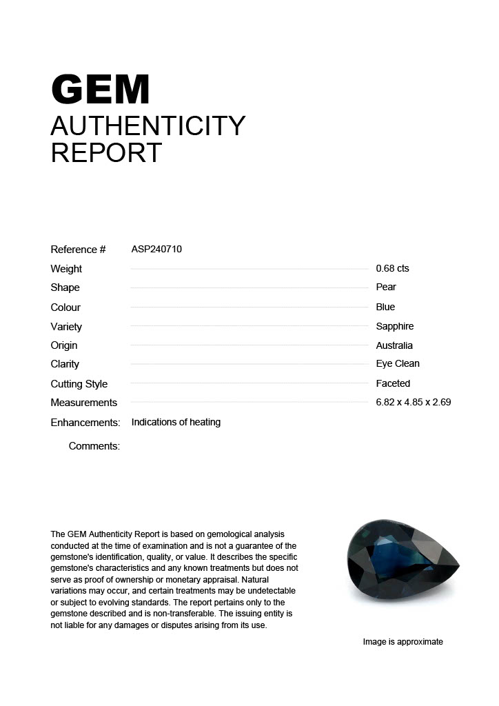 0.68ct Blue Pear Australia SapphireCarat: 0.68 ctType: SapphireCut: PearColour: BlueOrigin: AustraliaComment: Heated6.82 x 4.85 x 2.69 mm