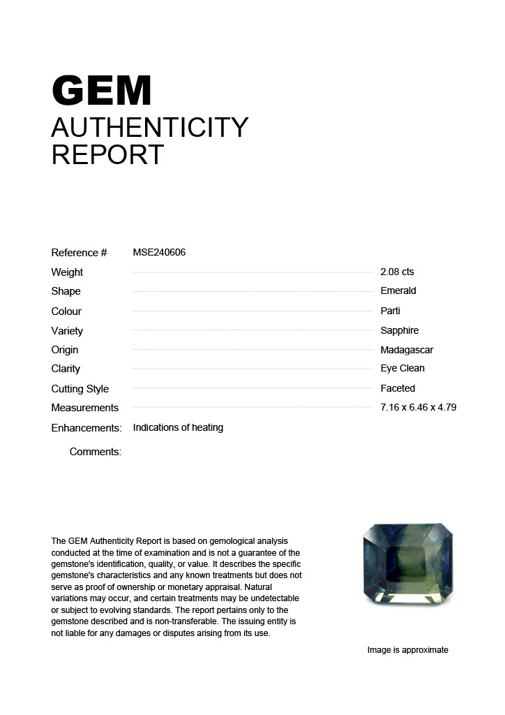 2.08ct Parti Emerald Madagascar SapphireCarat: 2.08 ctType: SapphireCut: EmeraldColour: PartiOrigin: MadagascarComment: Heated7.16 x 6.46 x 4.79 mm
