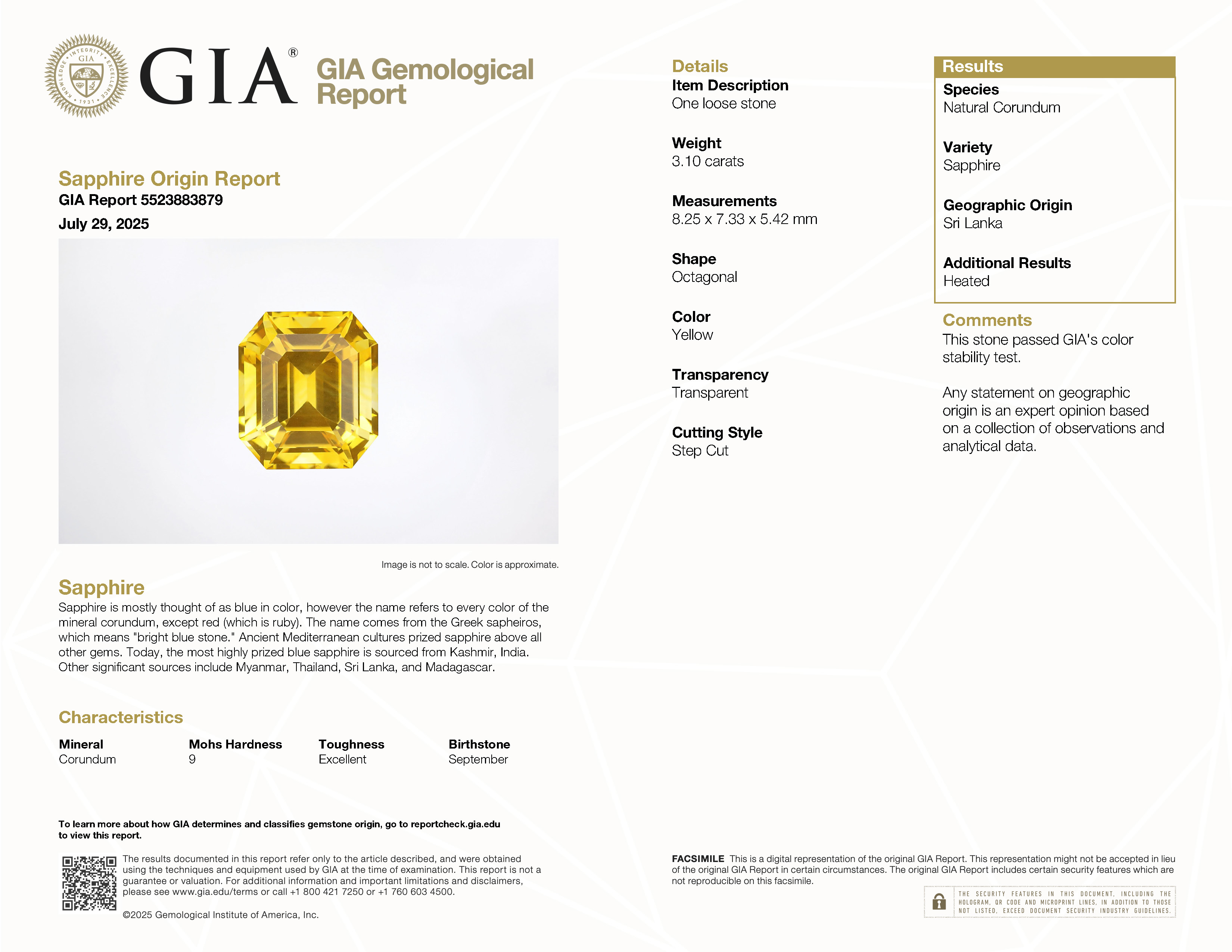 GIA: 5523883879 Stock ID: CE2409203.10ct Yellow Emerald Sri Lanka SapphireCarat: 3.10 ctType: SapphireCut: EmeraldColour: YellowOrigin: Sri LankaComment: Heated8.25 x 7.33 x 5.42 mm
