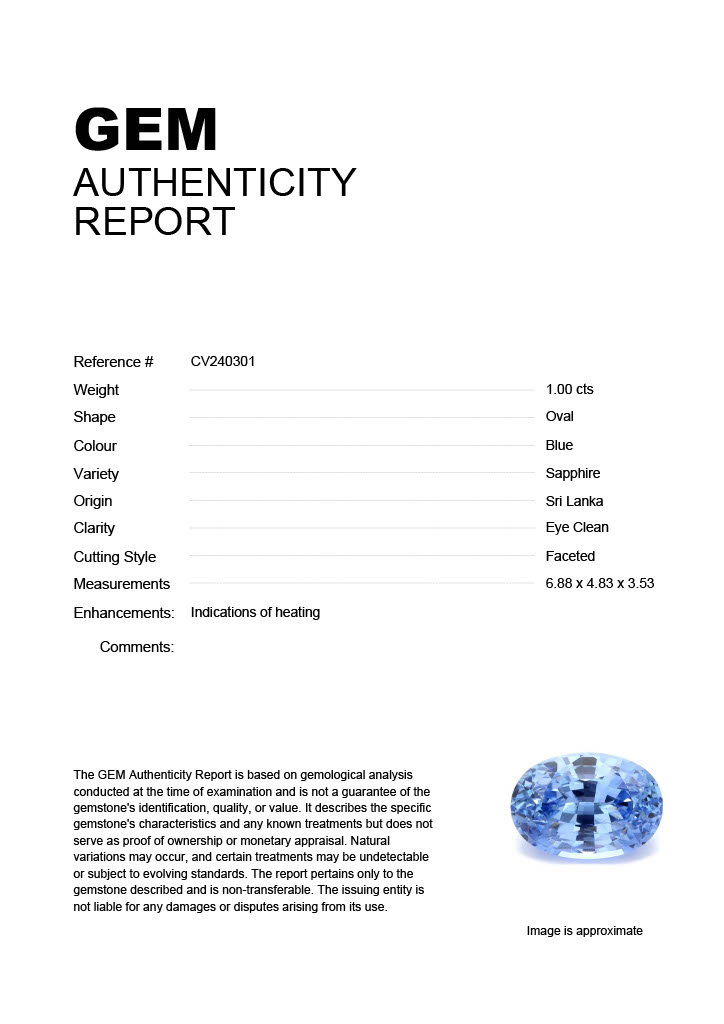 GEM: ASV2401007 Stock ID: ASV24010071.16ct Blue Oval Australia SapphireCarat: 1.16 ctType: SapphireCut: OvalColour: BlueOrigin: AustraliaComment: Heated7.09 x 5.15 x 3.48 mm