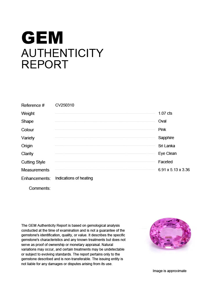 1.07ct Pink Oval Sri Lanka SapphireCarat: 1.07 ctType: SapphireCut: OvalColour: PinkOrigin: Sri LankaComment: Heated6.91 x 5.13 x 3.36 mm