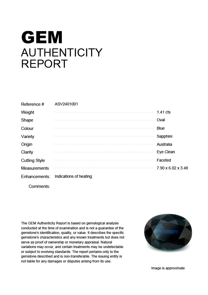 GEM: ASV2401001 Stock ID: ASV24010011.41ct Blue Oval Australia SapphireCarat: 1.41 ctType: SapphireCut: OvalColour: BlueOrigin: AustraliaComment: Heated7.90 x 6.02 x 3.48 mm