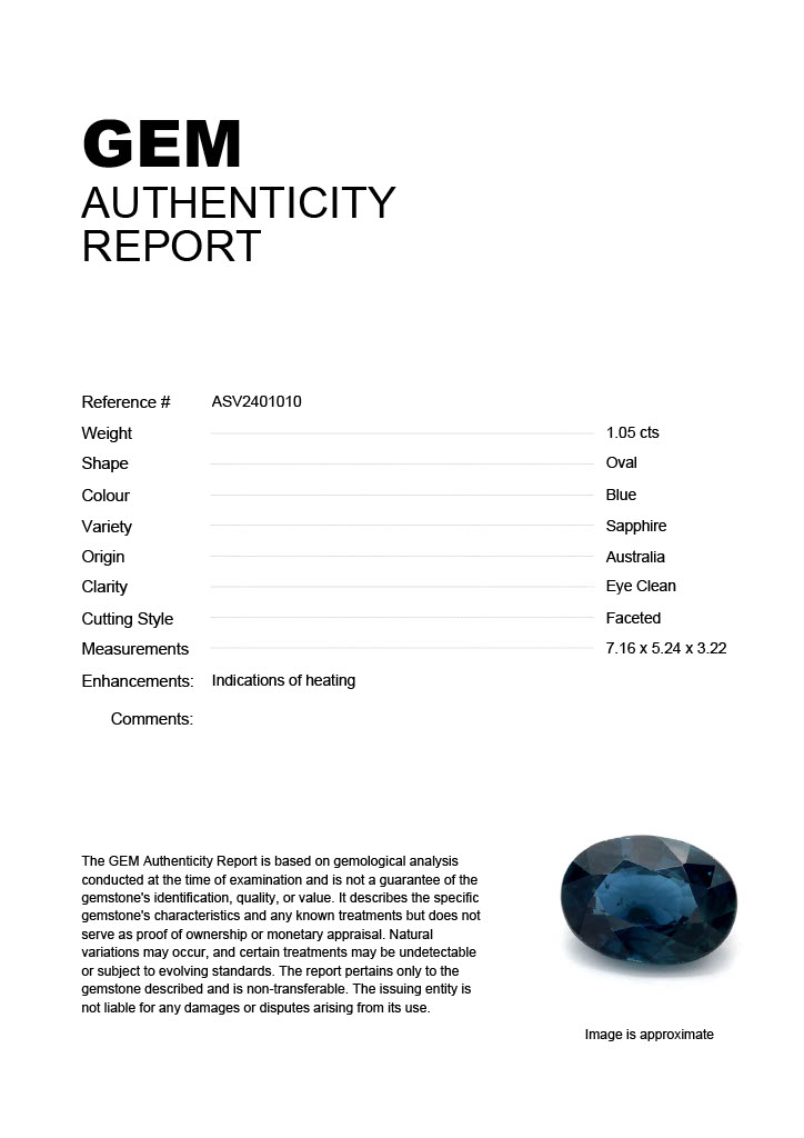 GEM: ASV2401010 Stock ID: ASV24010101.05ct Blue Oval Australia SapphireCarat: 1.05 ctType: SapphireCut: OvalColour: BlueOrigin: AustraliaComment: Heated7.16 x 5.24 x 3.22 mm