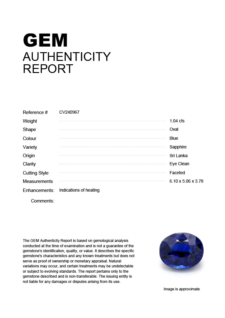 1.04ct Blue Oval Sri Lanka SapphireCarat: 1.04 ctType: SapphireCut: OvalColour: BlueOrigin: Sri LankaComment: Heated6.10 x 5.06 x 3.78 mm