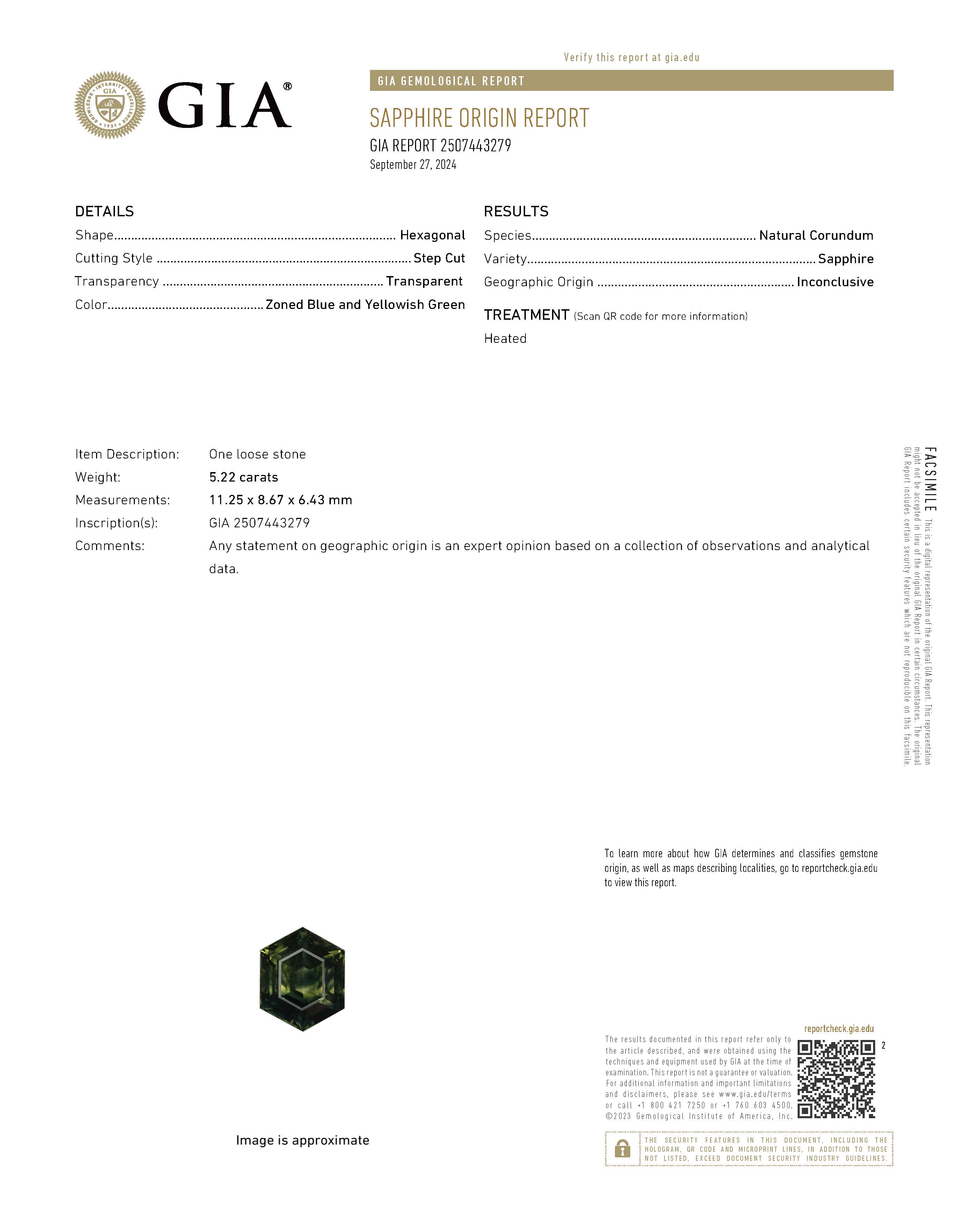 GIA: 2507443279 Stock ID: ASF2405015.22ct Parti Hexagonal Australia SapphireCarat: 5.22 ctType: SapphireCut: HexagonalColour: PartiOrigin: AustraliaComment: Heated11.25 x 8.67 x 6.43 mm