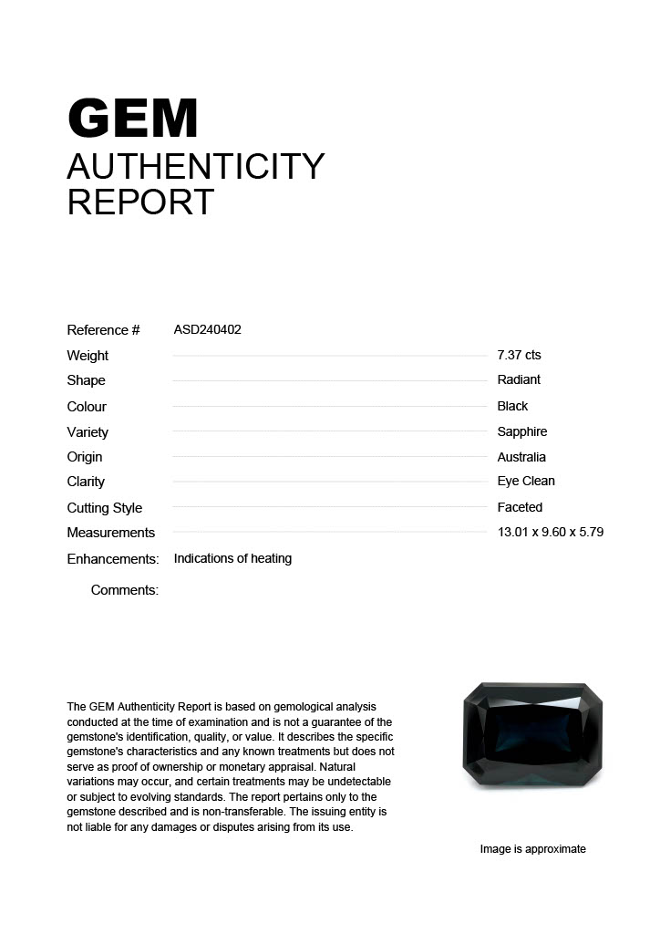 7.37ct Black Radiant Australia SapphireCarat: 7.37 ctType: SapphireCut: RadiantColour: BlackOrigin: AustraliaComment: Heated13.01 x 9.60 x 5.79 mm