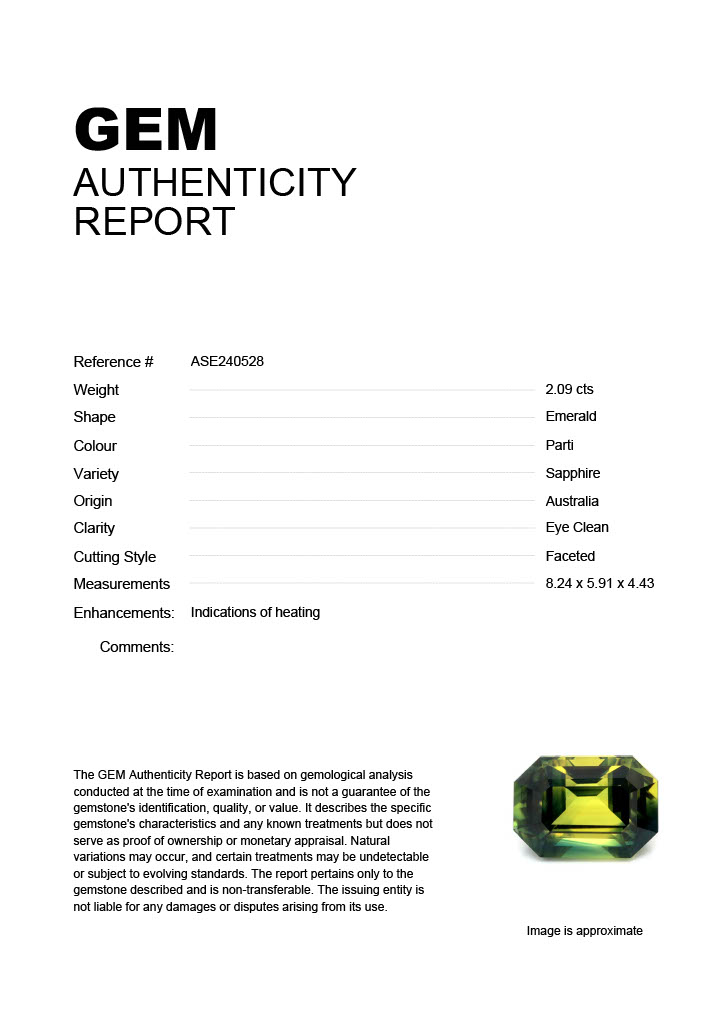 2.09ct Parti Emerald Australia SapphireCarat: 2.09 ctType: SapphireCut: EmeraldColour: PartiOrigin: AustraliaComment: Heated8.24 x 5.91 x 4.43 mm