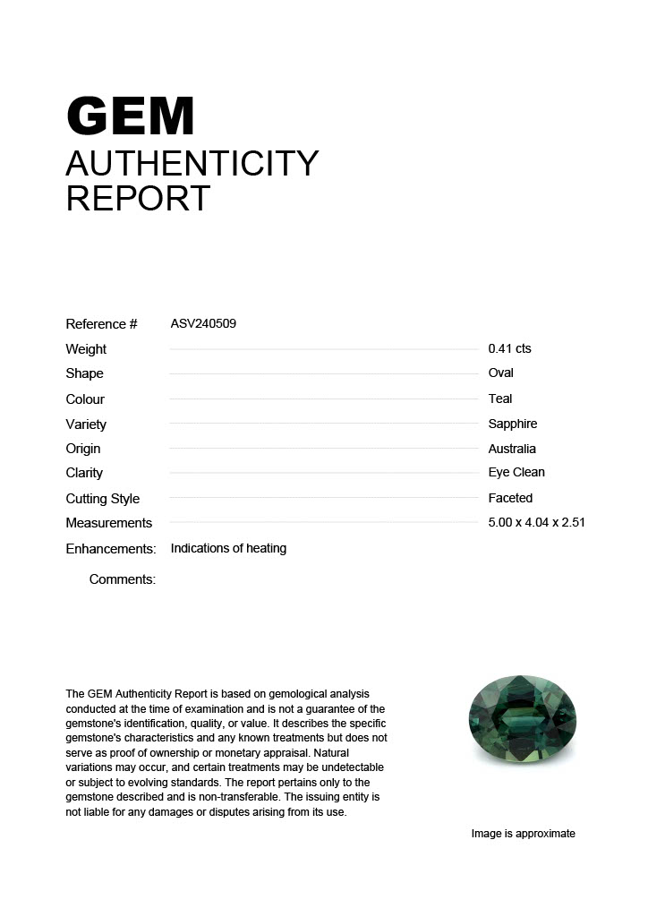 0.41ct Teal Oval Australia SapphireCarat: 0.41 ctType: SapphireCut: OvalColour: TealOrigin: AustraliaComment: Heated5.00 x 4.04 x 2.51 mm