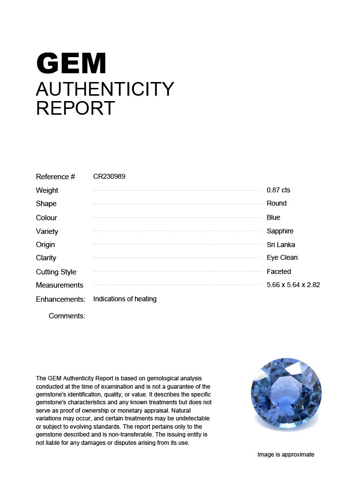 0.87ct Blue Round Sri Lanka SapphireCarat: 0.87 ctType: SapphireCut: RoundColour: BlueOrigin: Sri LankaComment: Heated5.66 x 5.64 x 2.82 mm