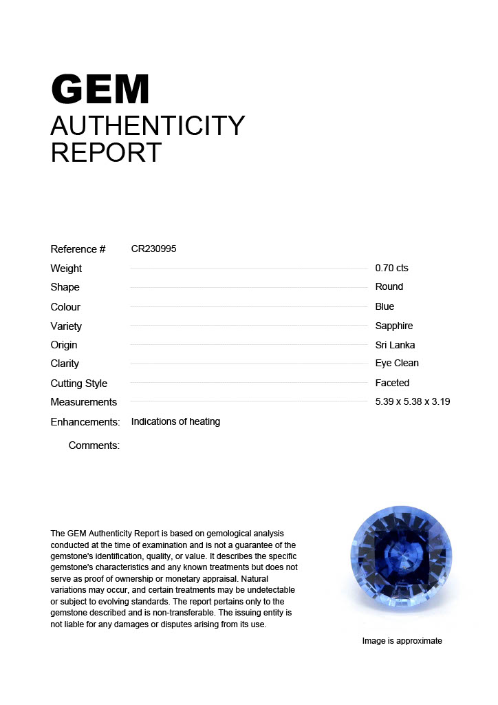 0.70ct Blue Round Sri Lanka SapphireCarat: 0.70 ctType: SapphireCut: RoundColour: BlueOrigin: Sri LankaComment: Heated5.39 x 5.38 x 3.19 mm